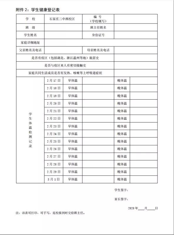 2、做好个人疫情监控:从2月17日起,要求学生在开学前继续居家隔离,坚持每天在班级群汇报行踪及身体健康情况,每天早晩两次测量体温,如实填写“学生健康登记表”,并撰写承诺书。在家隔离期间出现感冒、发热、咳嗽、乏力等症状,或接触疫区人员,如实记录并报班主任,不瞒报。