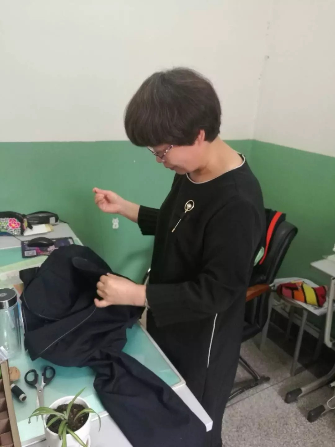 恩师手中线,学子身上衣。赵兰芳老师为学生缝补衣服。