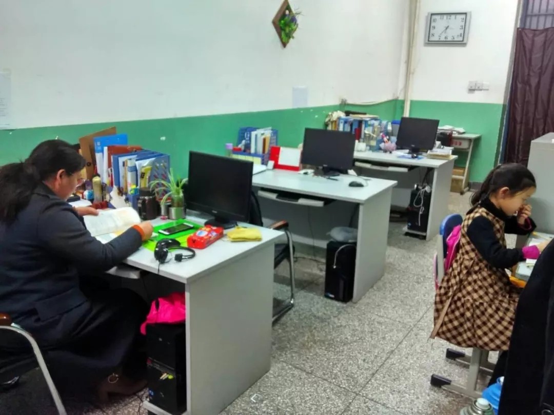 当老师的妈妈在学校加班,孩子在写作业。母女俩把学校当成了家。