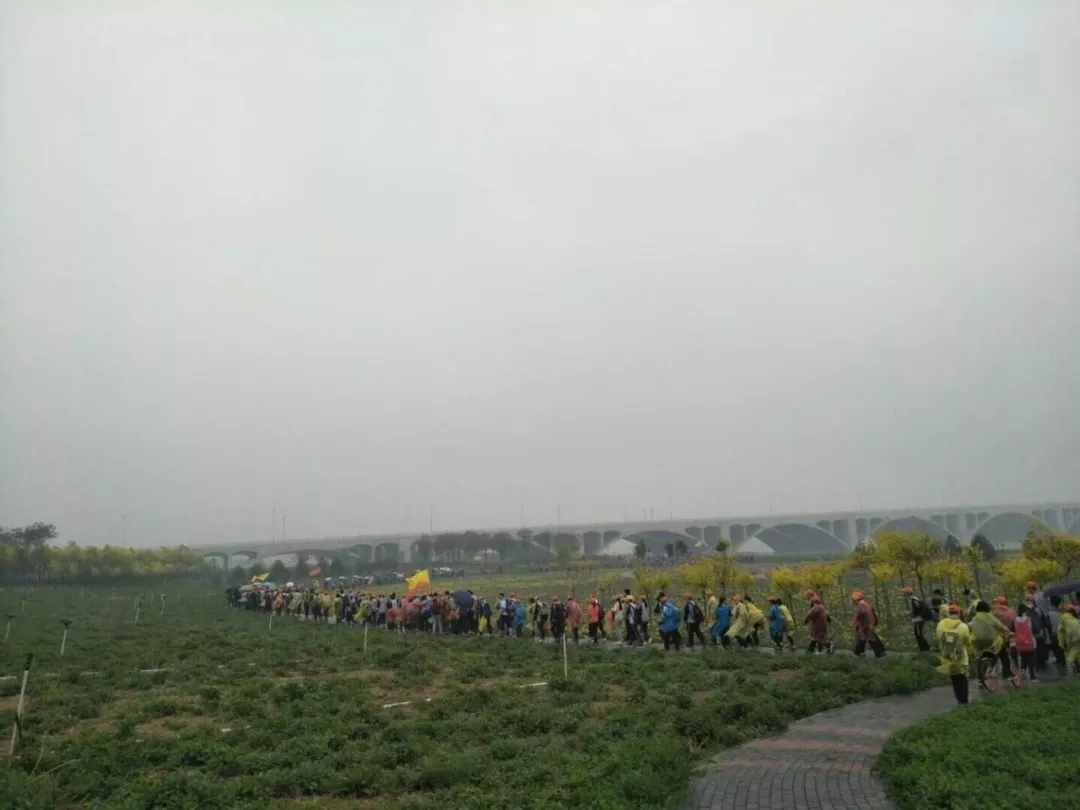 在纪念长征的远足励志活动中,我校学子在雨中穿过滹沱河花海。