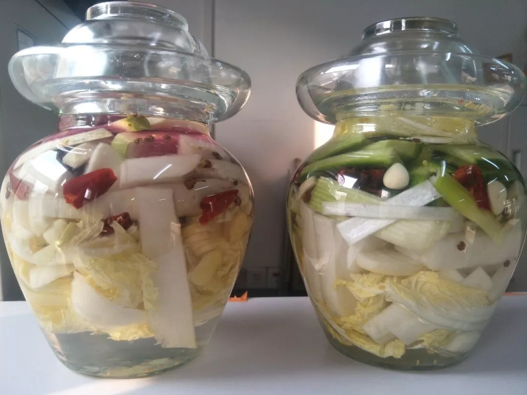 泡菜, 口感爽脆 , 滋味酸辣 , 是家常美味菜肴 。要制作地道的泡菜 ,需要 选应季最鲜嫩饱满的蔬菜, 腌制前 , 洗干净 , 轻微脱水。盐和凉白开按比例混合 , 放上 萝卜、姜、 白菜 , 再放上辣椒 、 蒜头 、 花椒 等 。在 乳酸 菌的作用下, 蔬菜中的糖转化成乳酸 , 造就了泡菜酸爽的风味。往坛沿里倒进清水 , 阻断空气和细菌。十几天 后 , 微生物的辛勤劳动赋予蔬菜新的活力。褪去艳丽和生涩 , 变得清亮、脆嫩、酸冽。