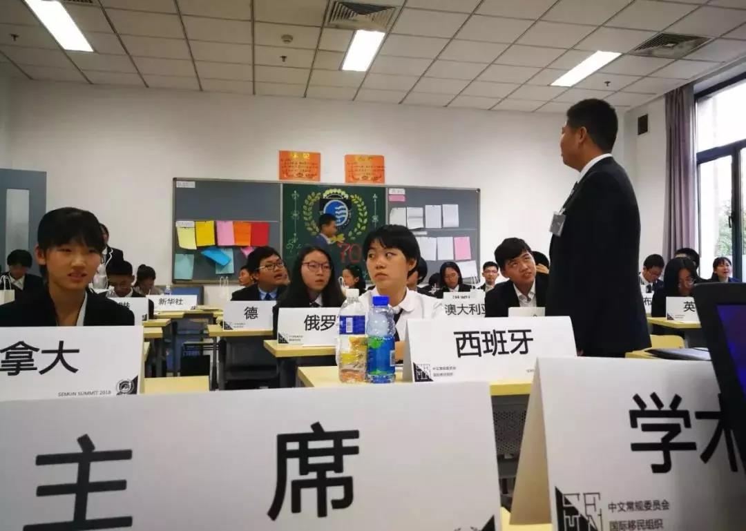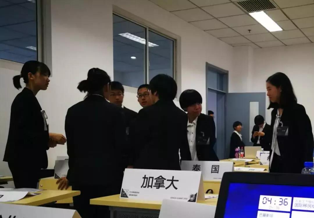 会议期间,男生女生都换上了庄重的西服,手上拿着代表国家的中英文字牌,每当大家有意见要发表时,就会举起牌子示意大会主席。参会代表精湛的学术水平、良好的外交礼仪、积极有效的解决方案和娴熟流畅的语言表达均给主席团和参会代表留下了深刻的印象。