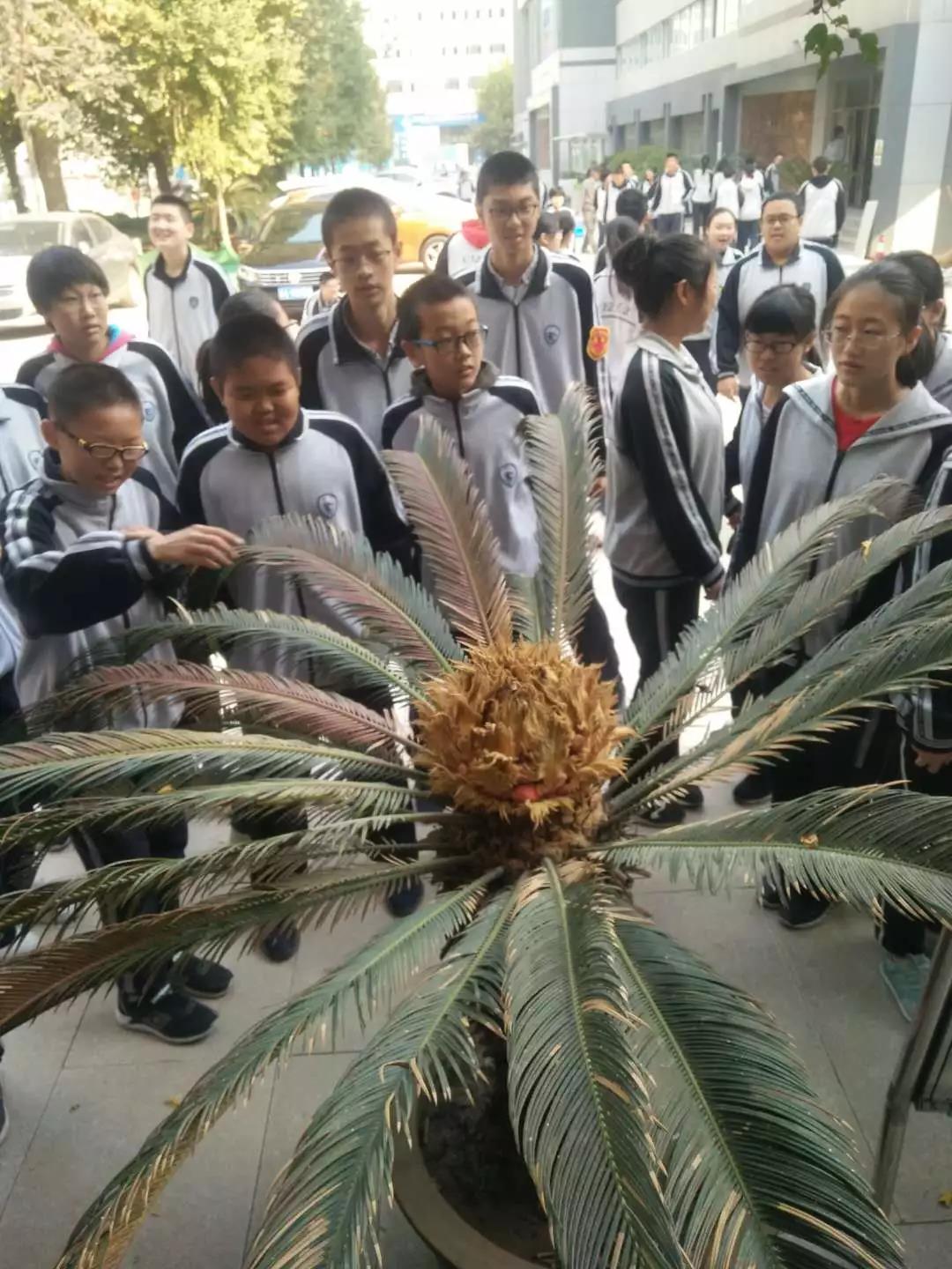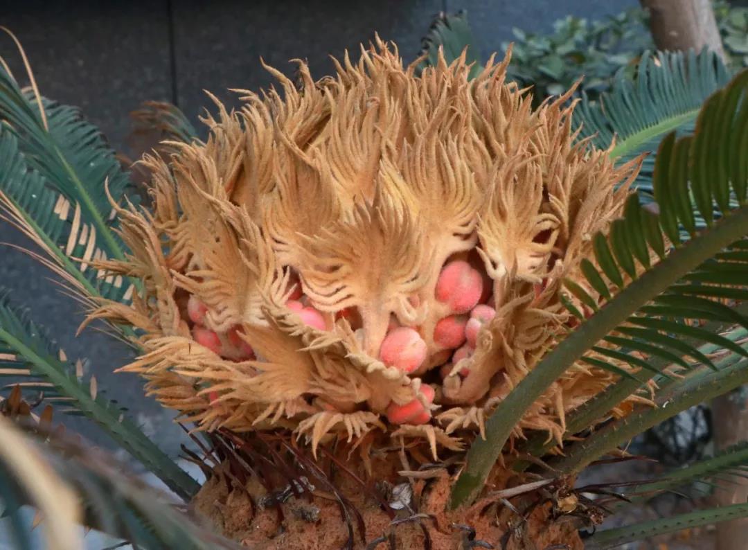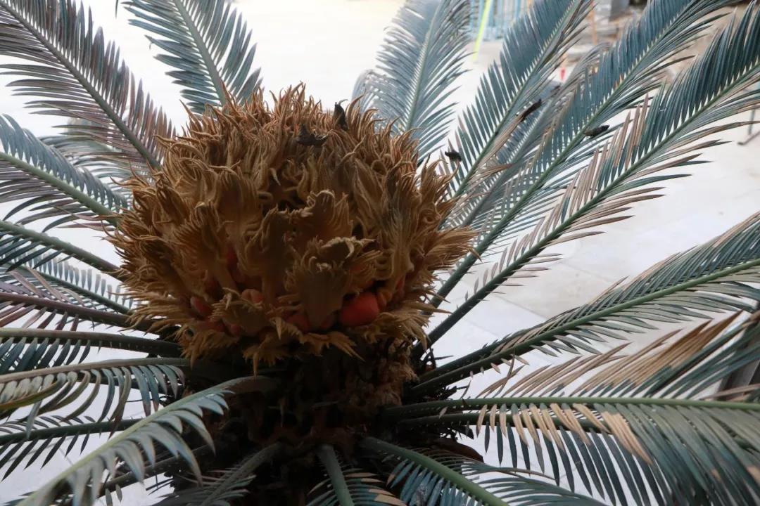 铁树开花 结果 了。你看,淡黄的 花朵 , 如波浪起伏,火苗跳跃,在舞动着自己的生命, 在 秋风送爽 的日子,自由地开放。 花朵中间,被小心翼翼守护着的,是沉甸甸的、红色的果实。 它 的 华贵 大气 , 吸引了师生驻足观看, 一下子就震撼了 人 的心灵。 铁树的果实,又名凤凰蛋,走进细看,的确像是温馨的鸟巢,是新生命的摇篮。