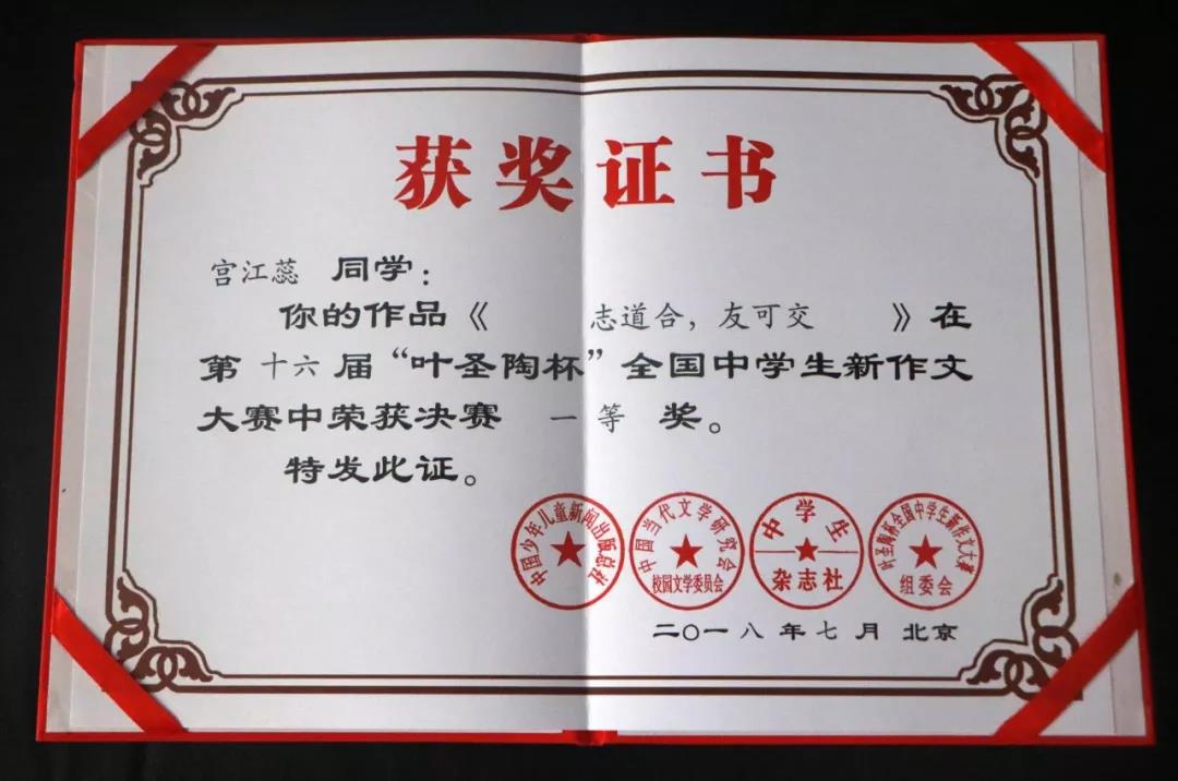 在第十六届“叶圣陶杯”全国中学生新作文大赛全国现场决赛中,我校学子喜获佳绩。其中, 宫江蕊 同学 获得决赛一等奖,胡昕蕙同学获得二等奖。边一老师获得模范教师称号。我校被组委会评为“全国中学示范文学社团”。除此之外,数十名同学在省级比赛中获奖。