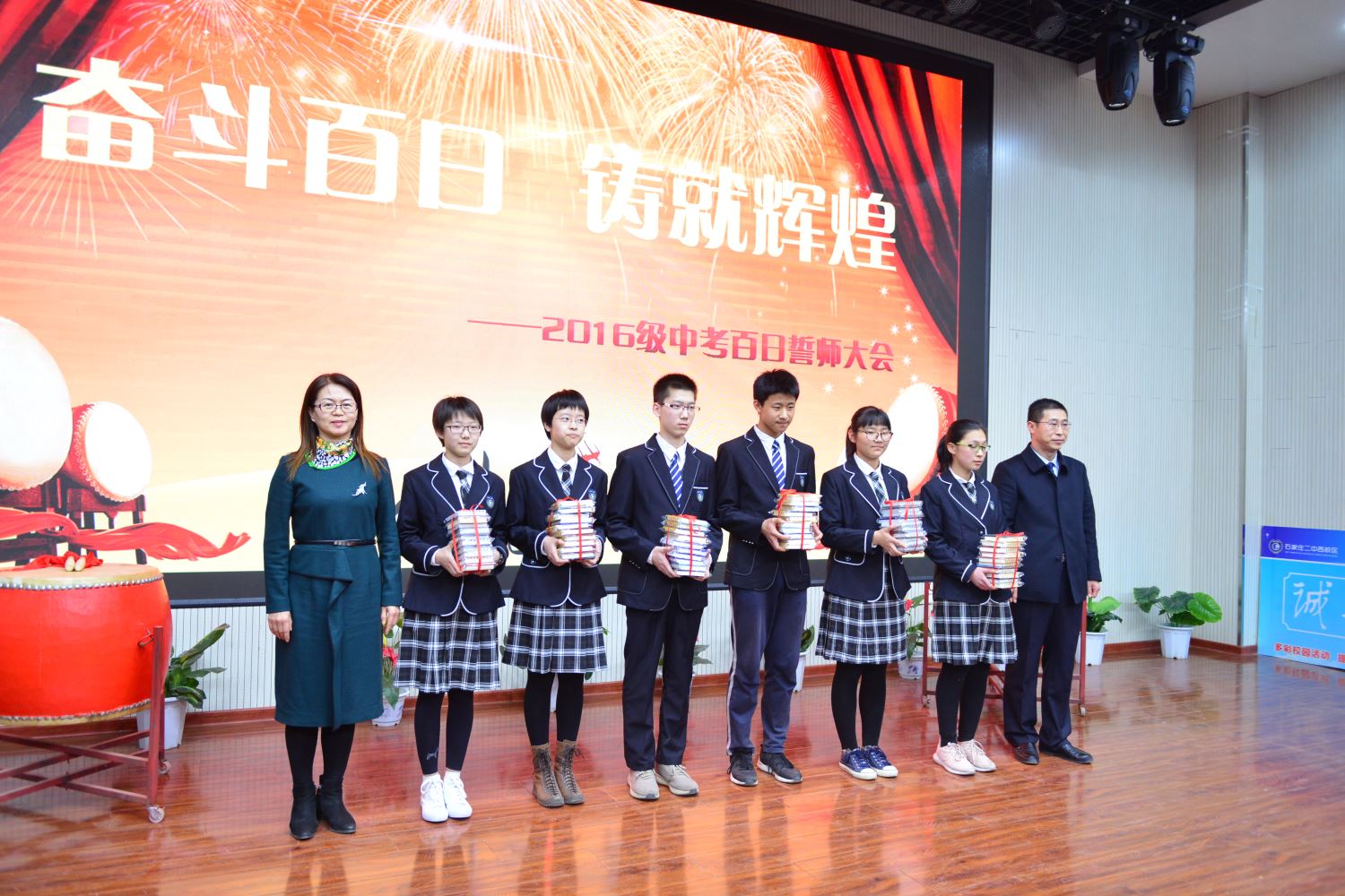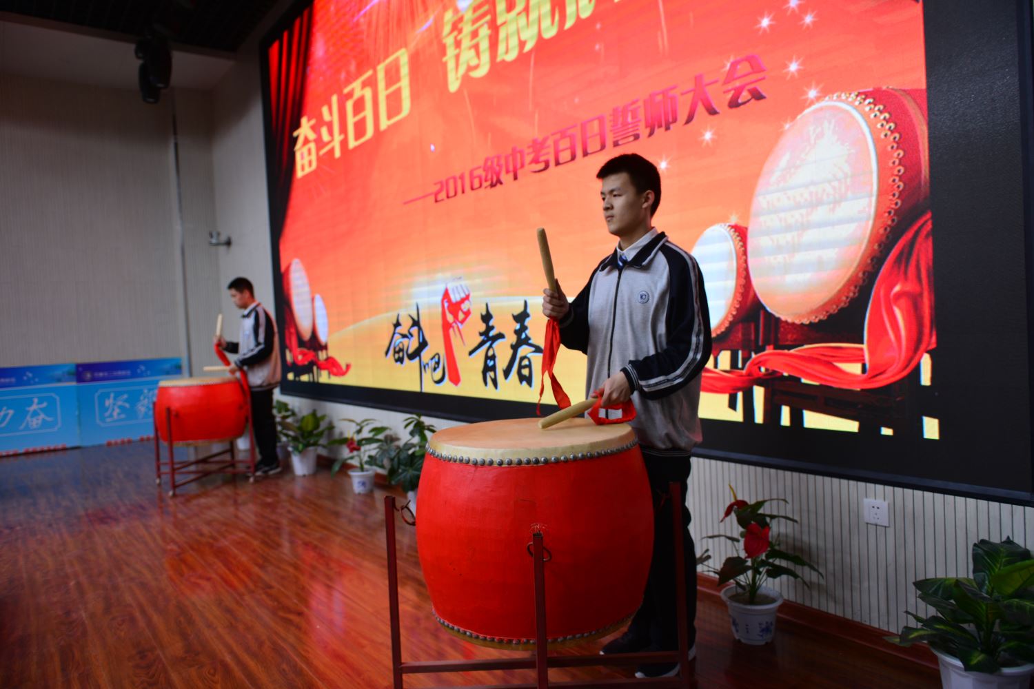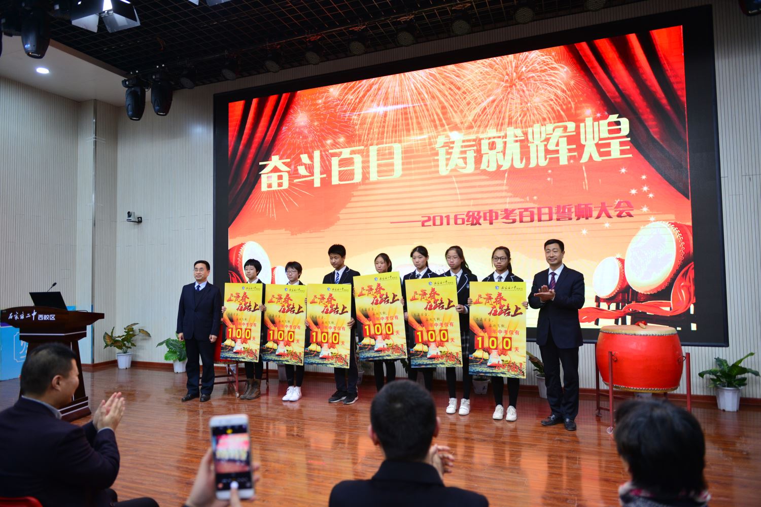 伴随着初三六班宋佳恒、刘烁同学擂起的战鼓声,百日誓师大会正式拉开了序幕。
