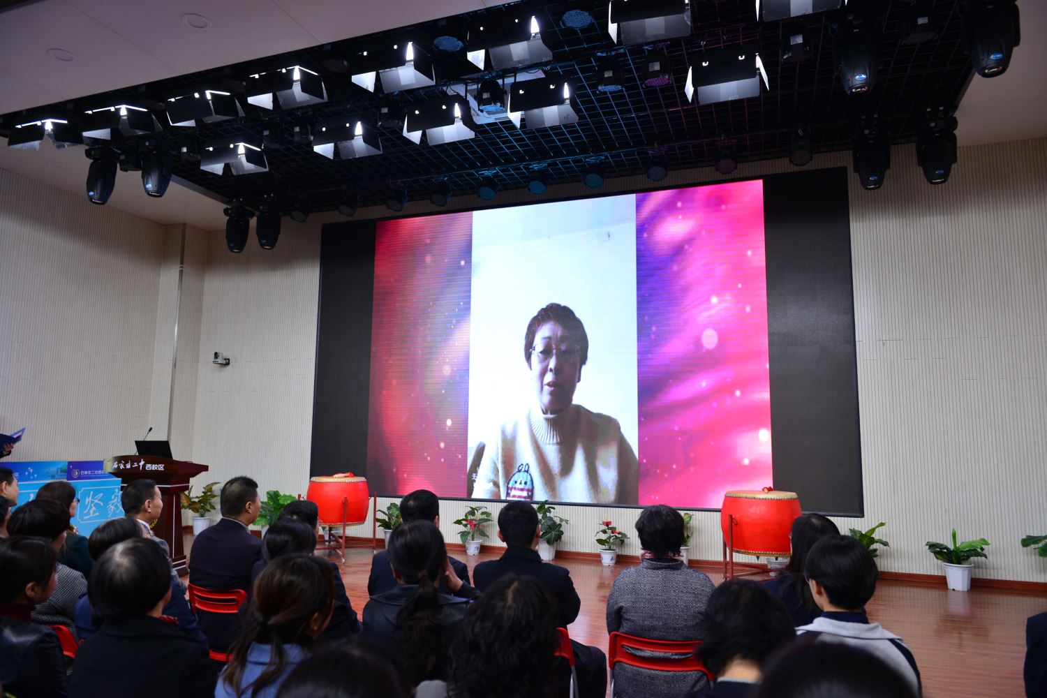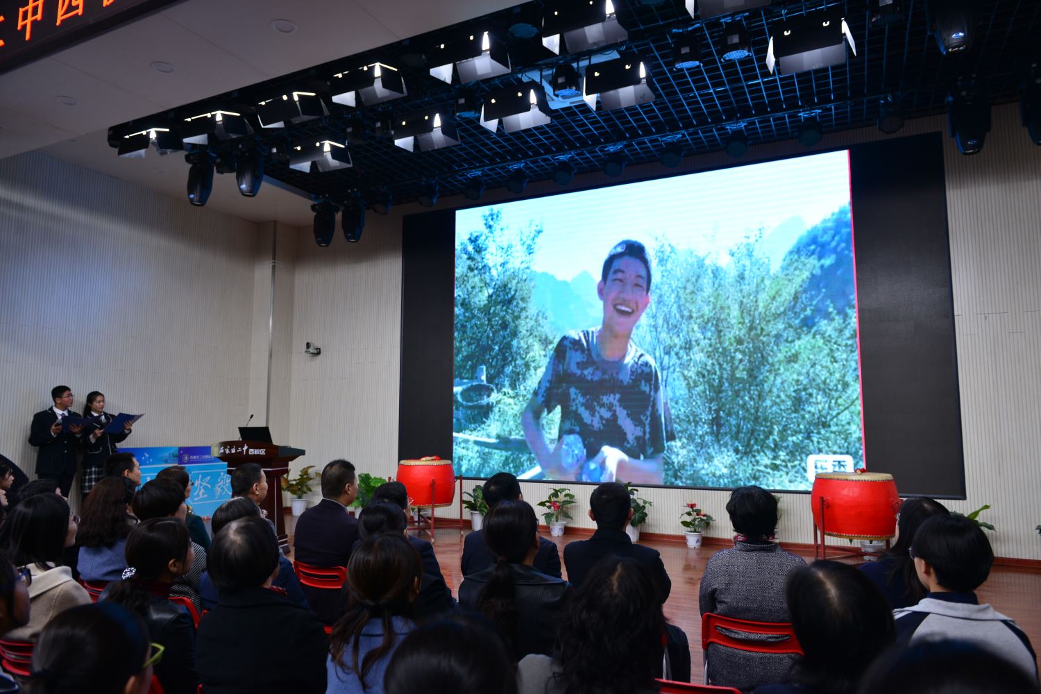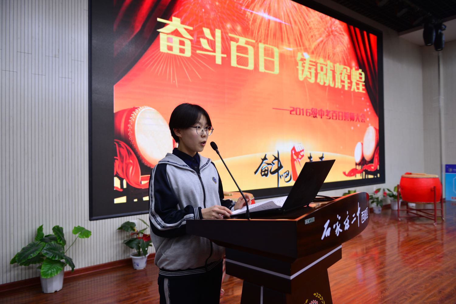 伴随着初三六班宋佳恒、刘烁同学擂起的战鼓声,百日誓师大会正式拉开了序幕。