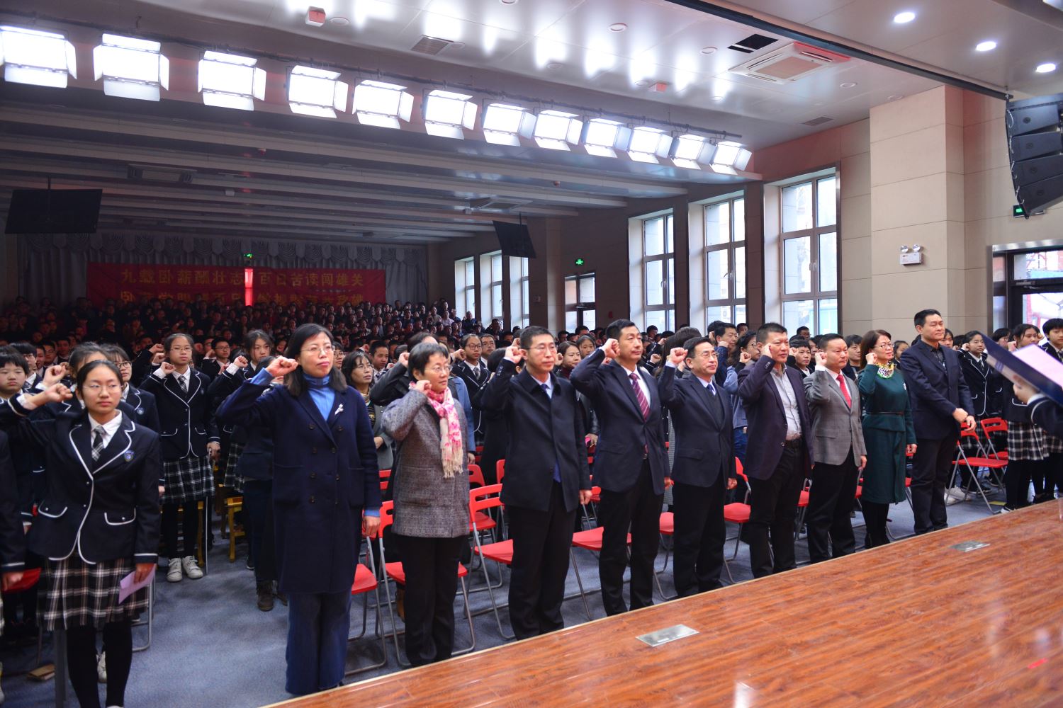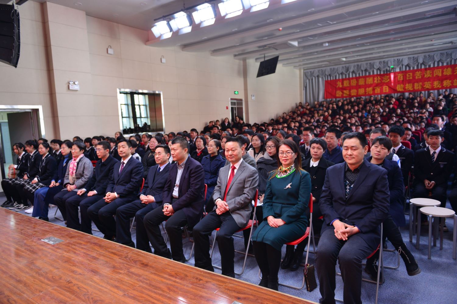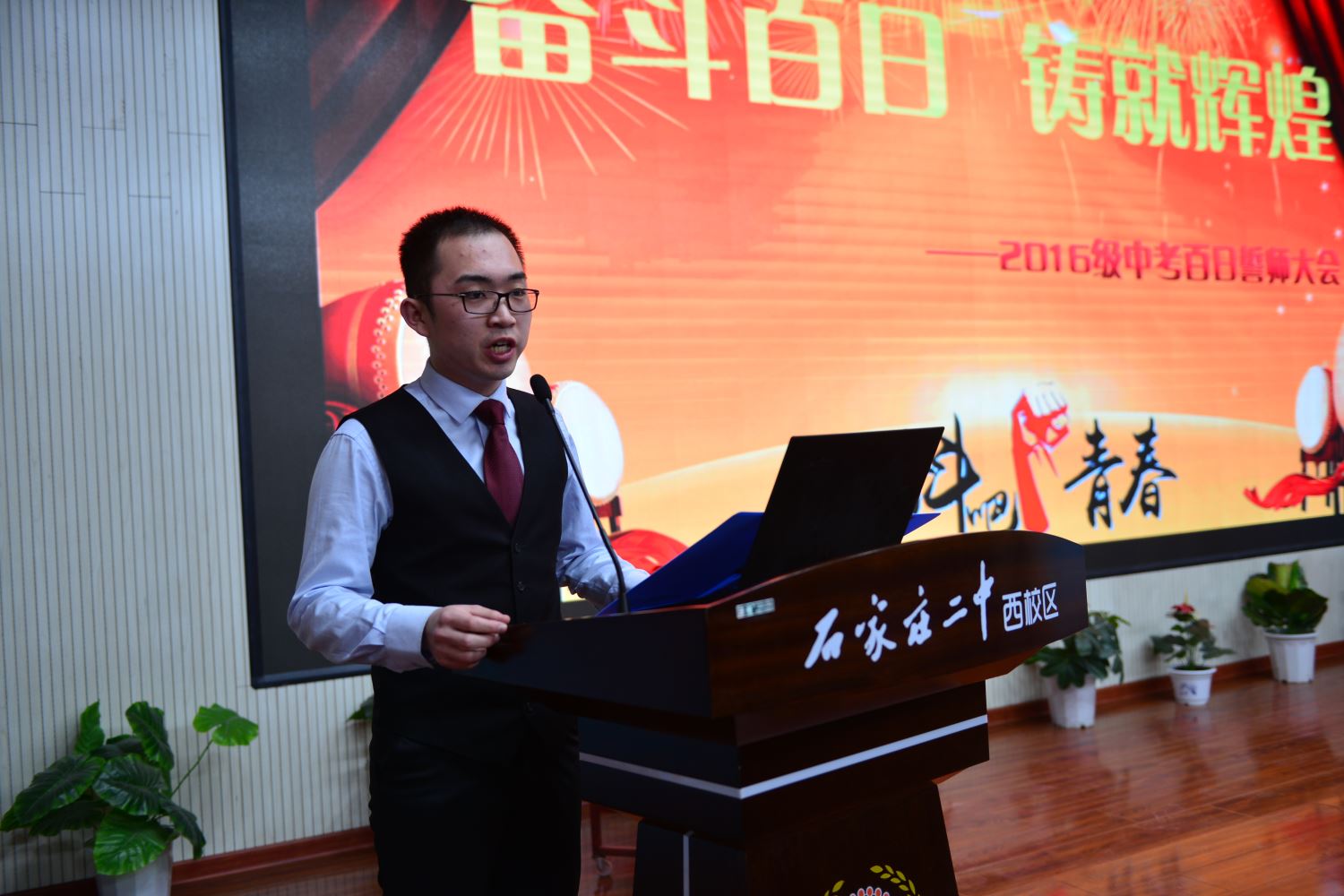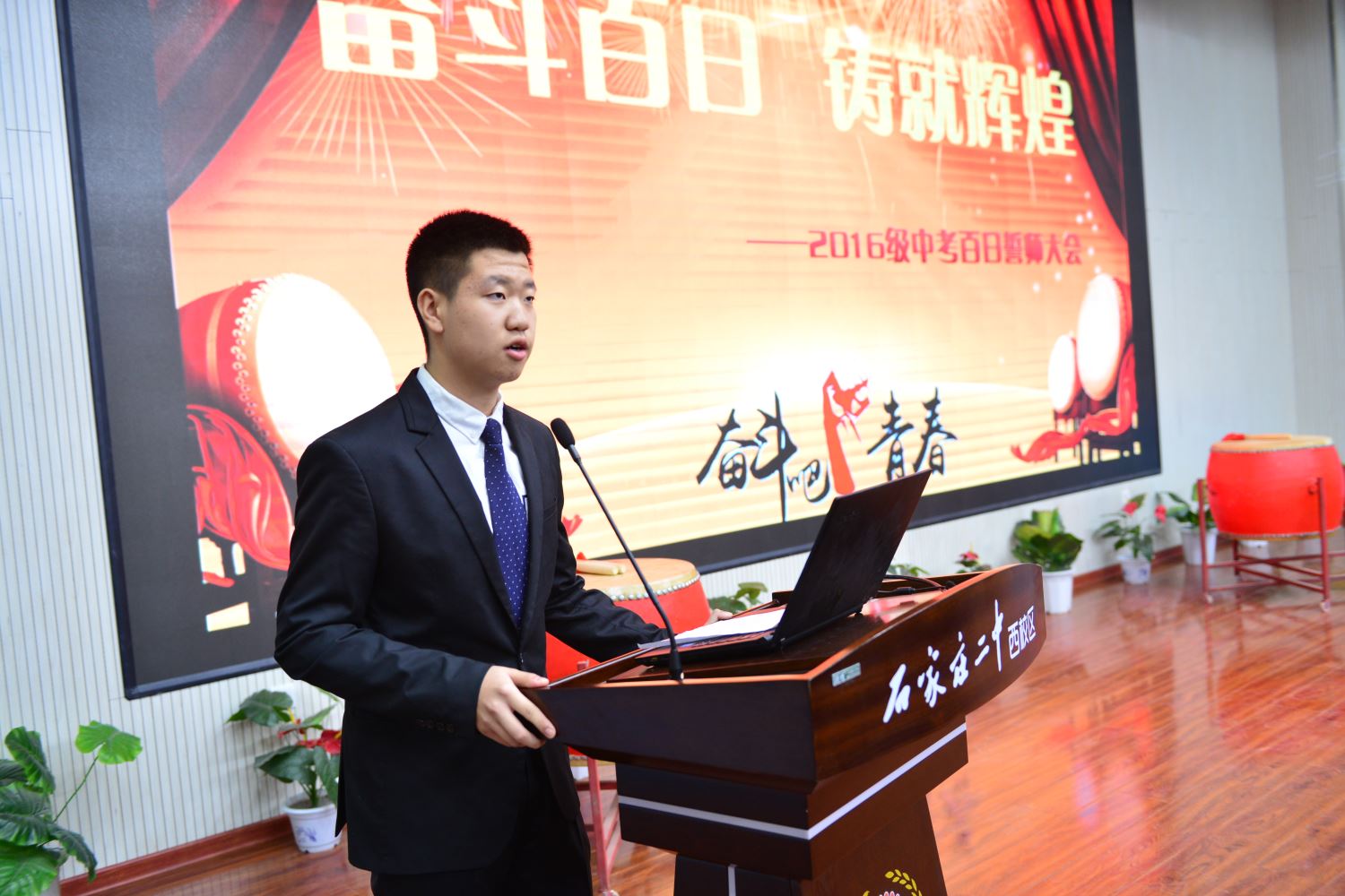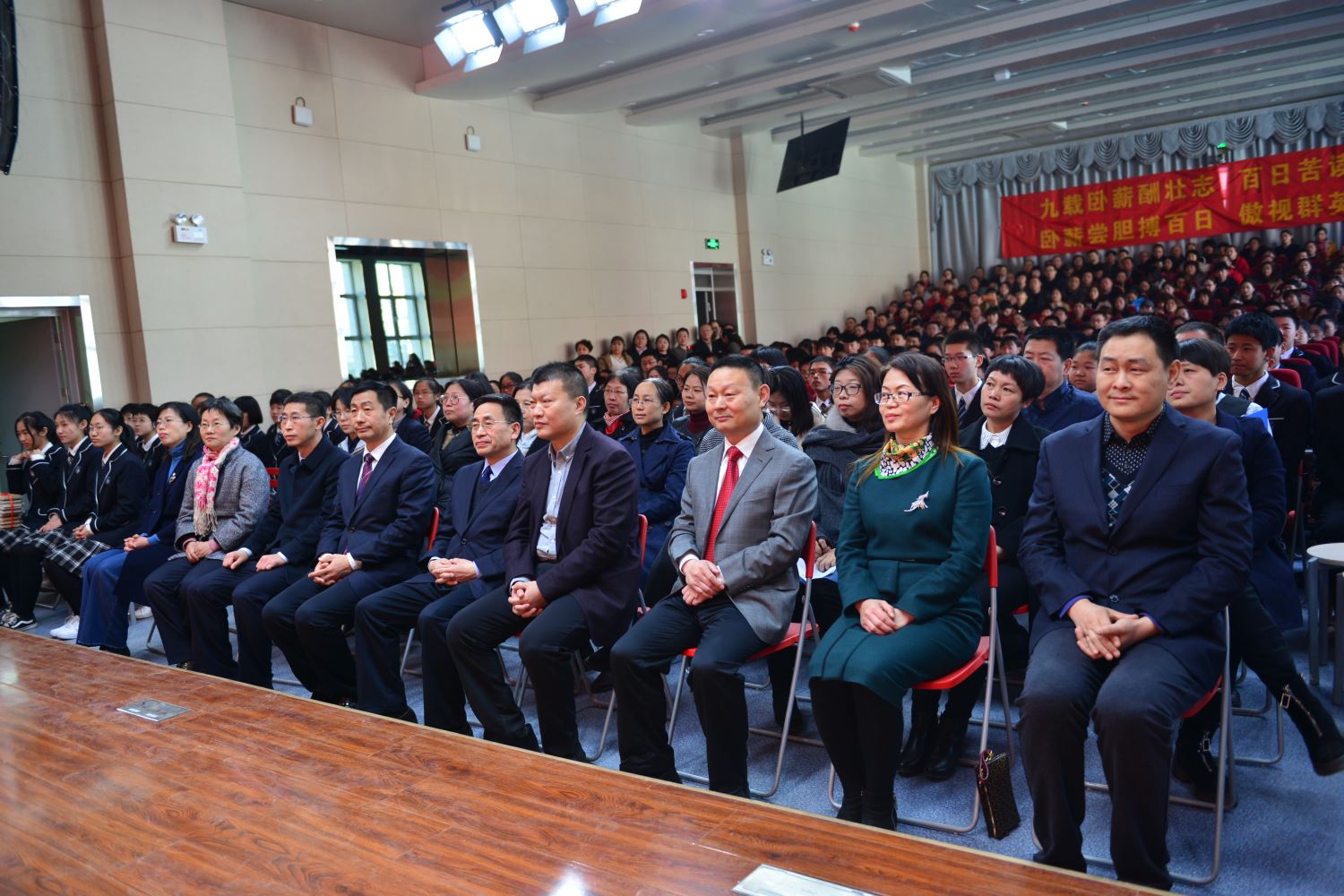 陈怀彦书记,张永泽副校长向各班授倒计时牌, 樊茹副校长、张尚英副校长向各班颁发百日计划历。 各班班主任依次向自己的班级送出了寄语,带领各个班级的同学们共同宣誓。一句句的誓言,像是雷霆在碰撞,像是火山在喷发。只有经过拼搏诠释的青春,才不会苍白。只有经过奋斗考验的青春,才能不留遗憾!
