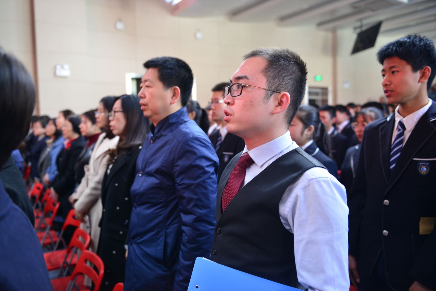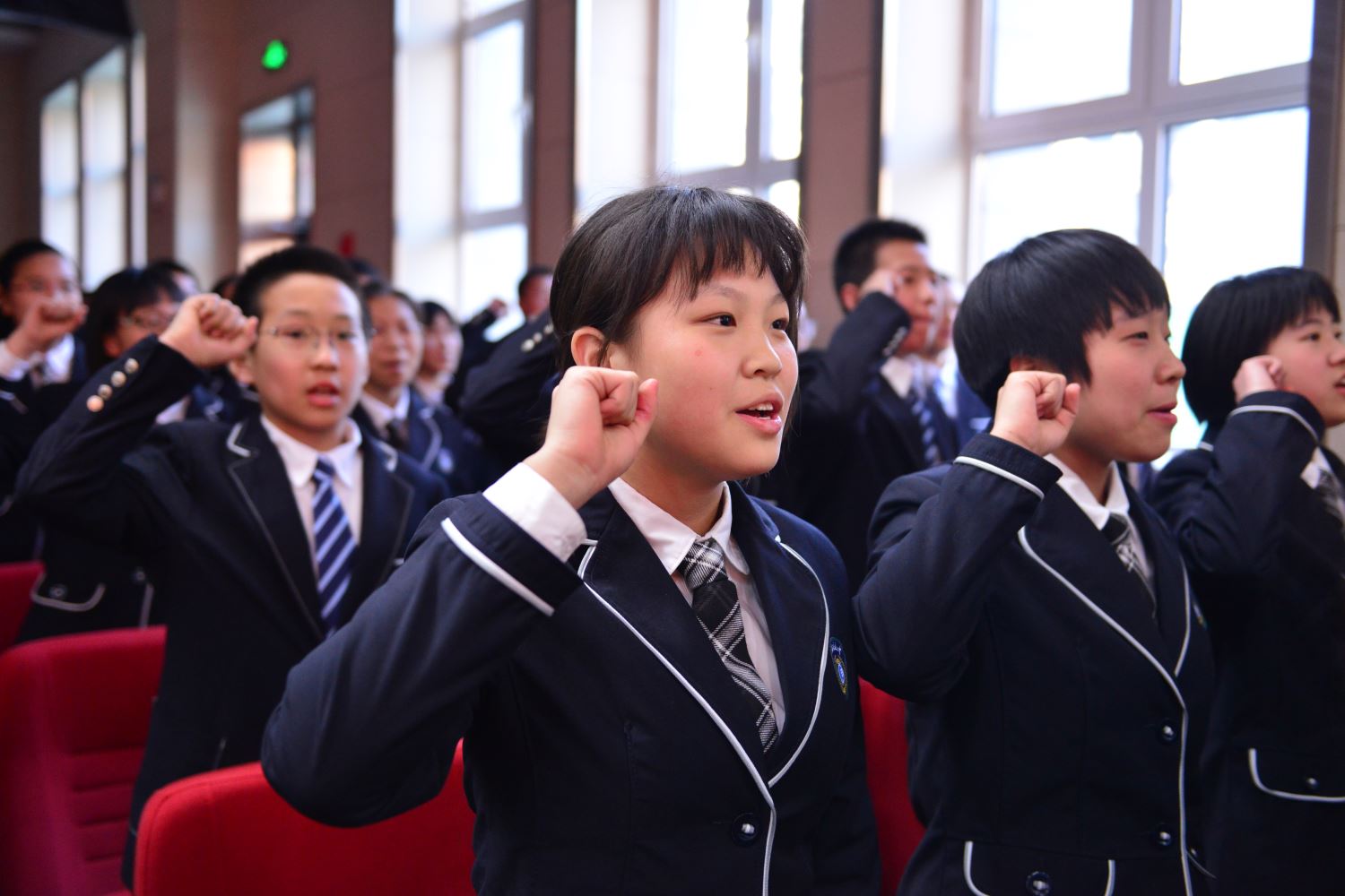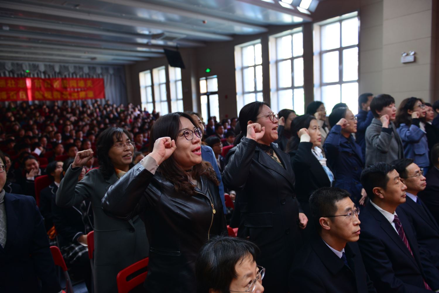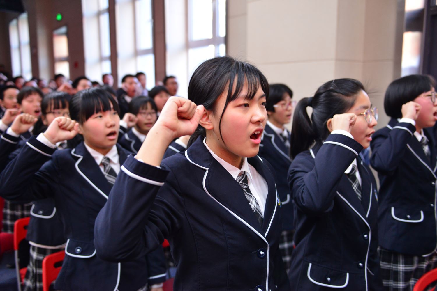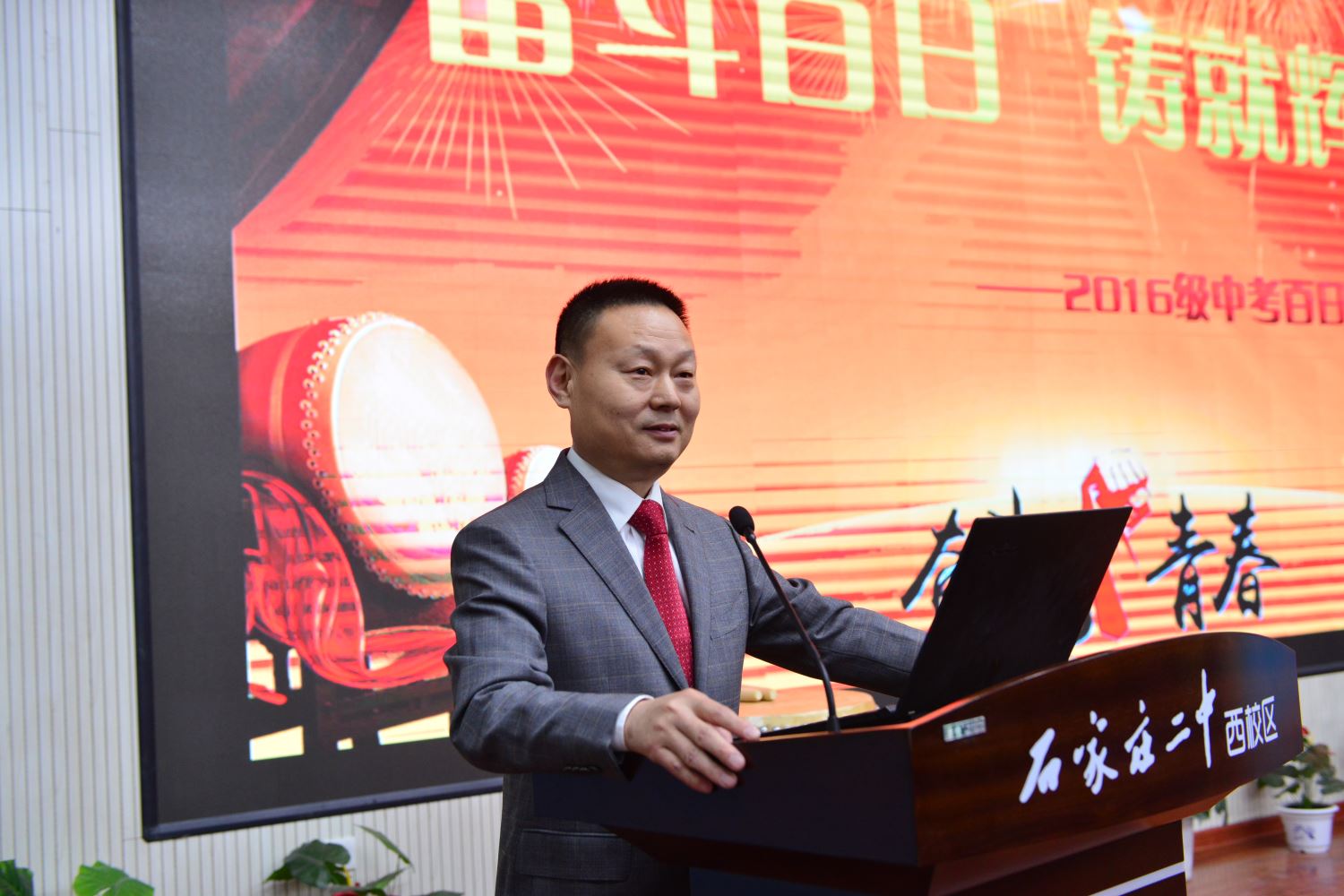 陈怀彦书记,张永泽副校长向各班授倒计时牌, 樊茹副校长、张尚英副校长向各班颁发百日计划历。 各班班主任依次向自己的班级送出了寄语,带领各个班级的同学们共同宣誓。一句句的誓言,像是雷霆在碰撞,像是火山在喷发。只有经过拼搏诠释的青春,才不会苍白。只有经过奋斗考验的青春,才能不留遗憾!
