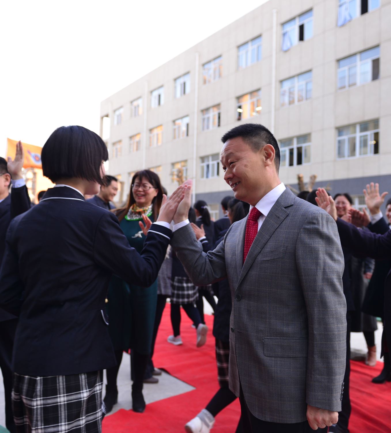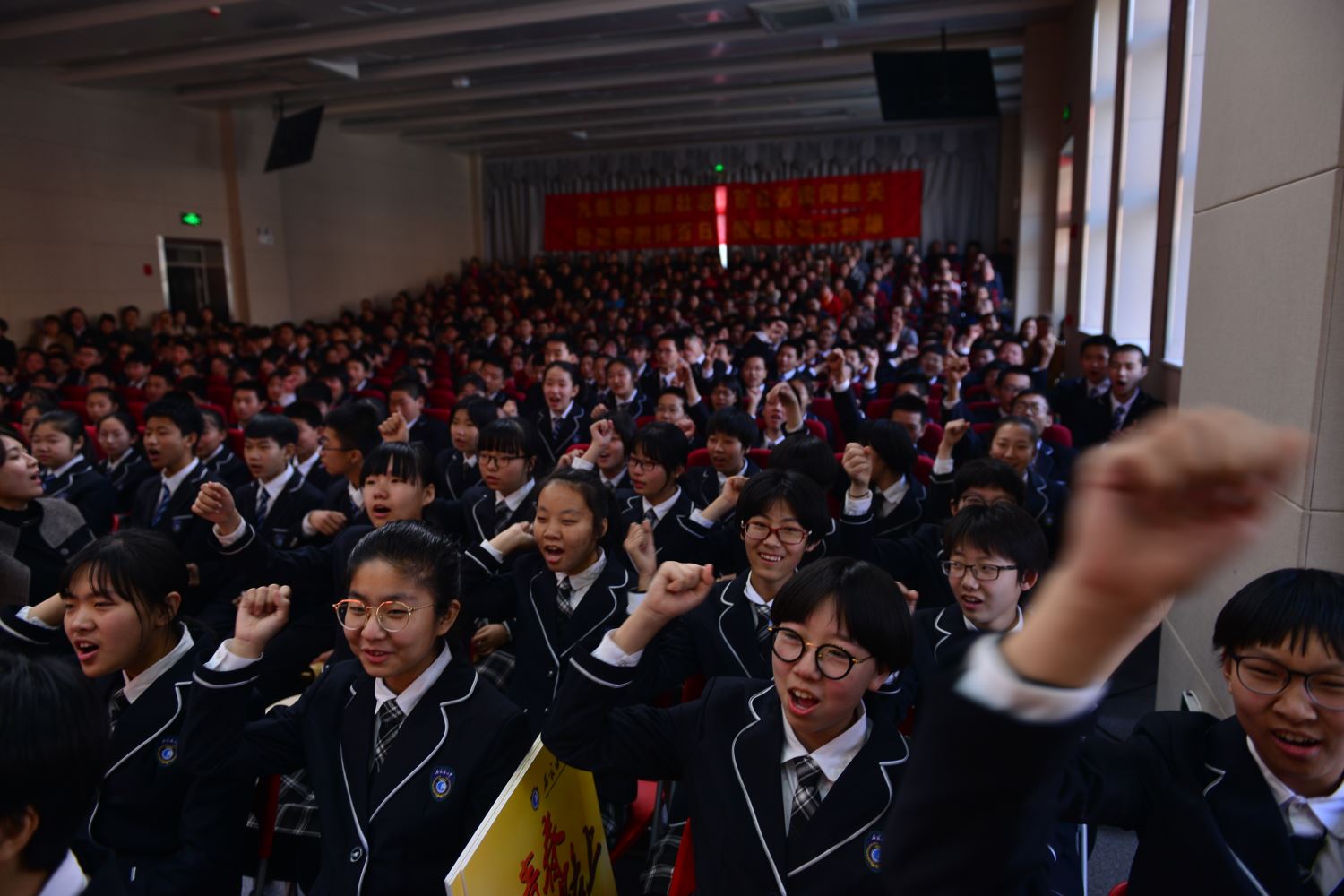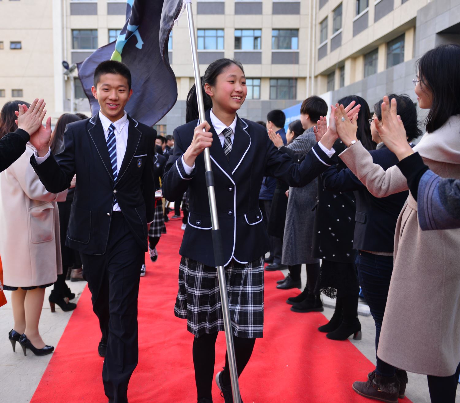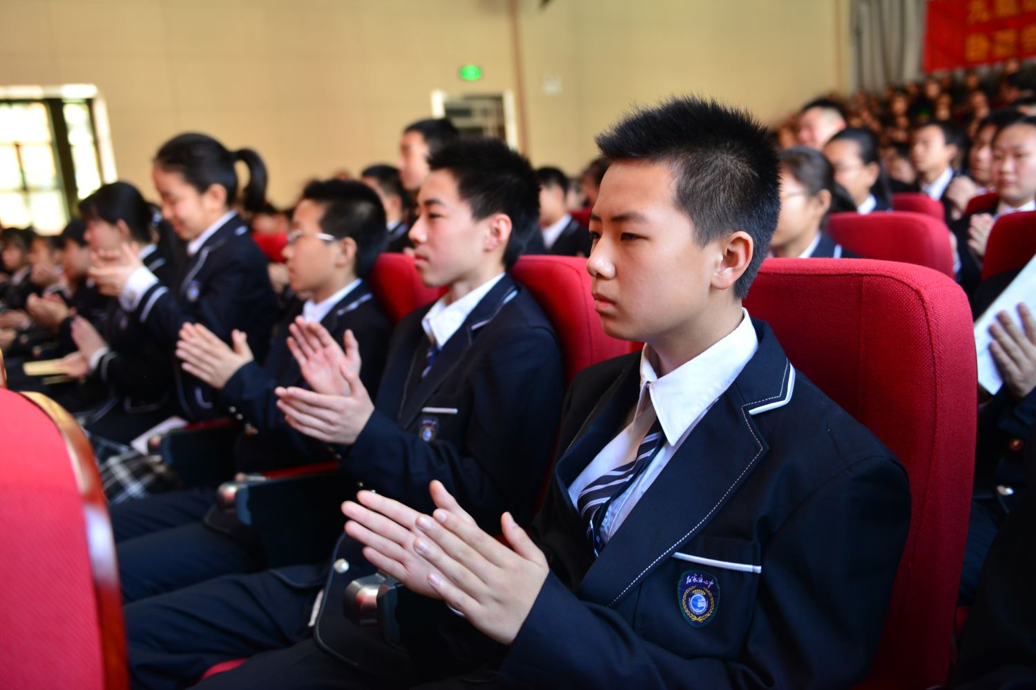在誓师大会结束后,家长与老师站在报告厅外红毯的两侧,与扬着班旗列队走出的同学们击掌助威。六月,二中西的校园不仅会洒满胜利的花瓣,而且必将果实累累。同学们,挥舞战旗,出征吧!