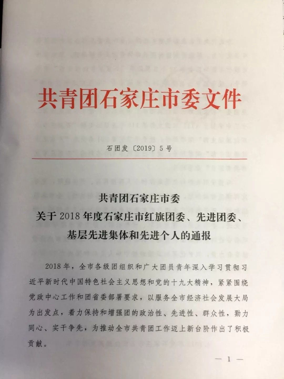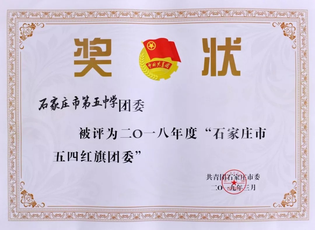 近日,我校团委被评为2018年度“石家庄市五四红旗团委”。特此表示祝贺!