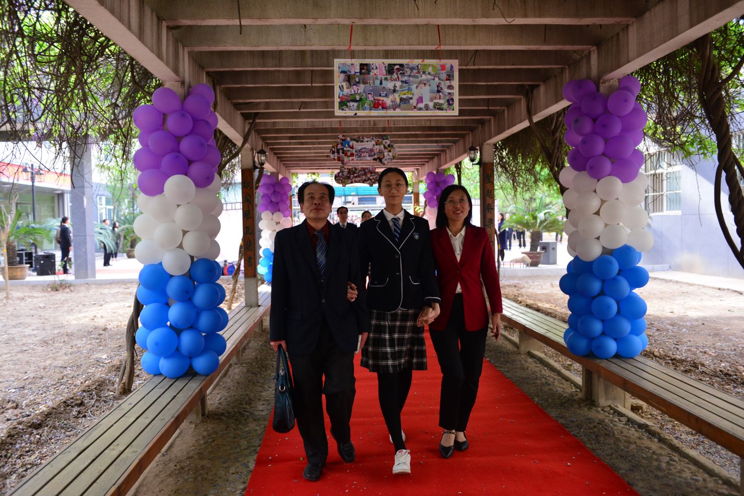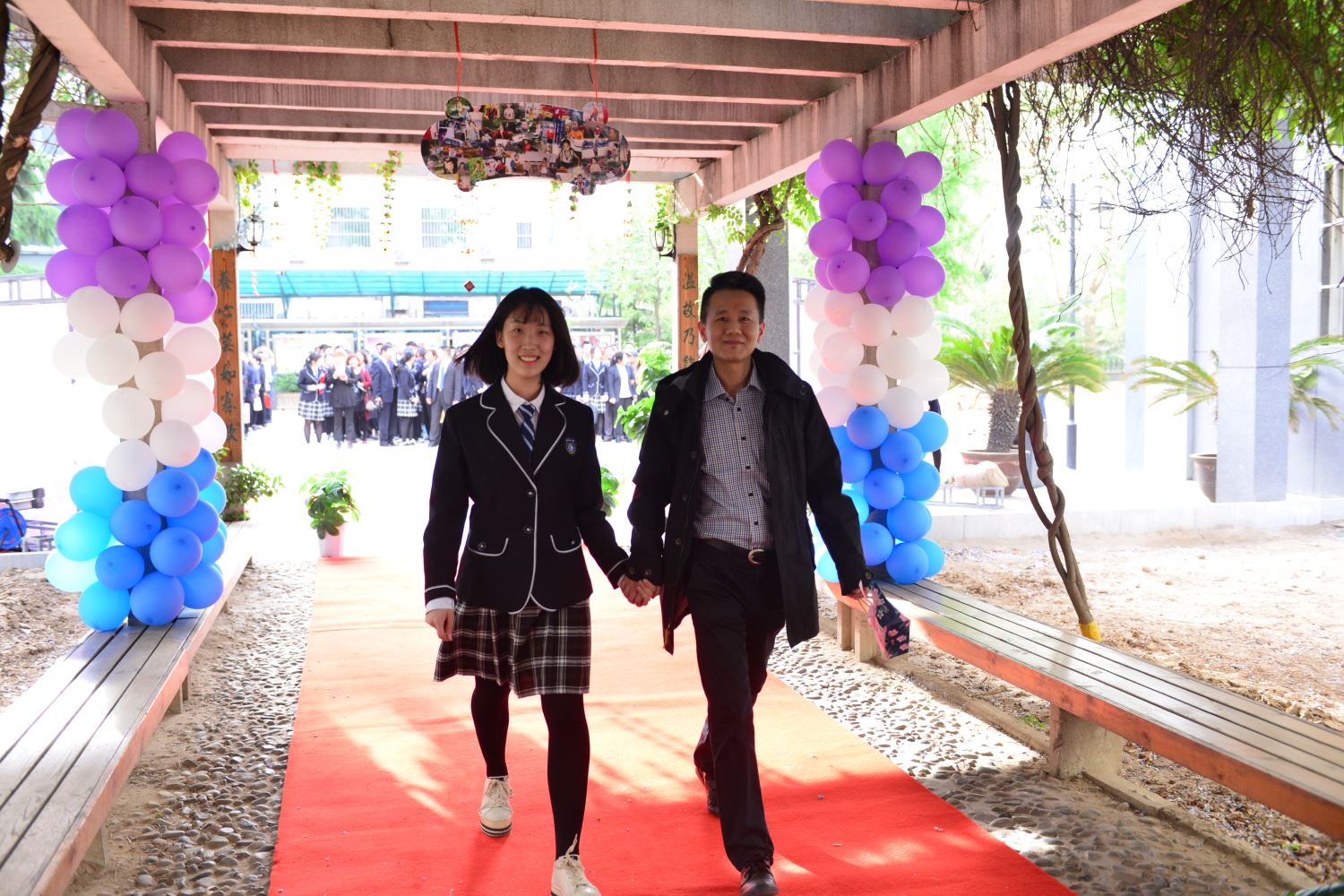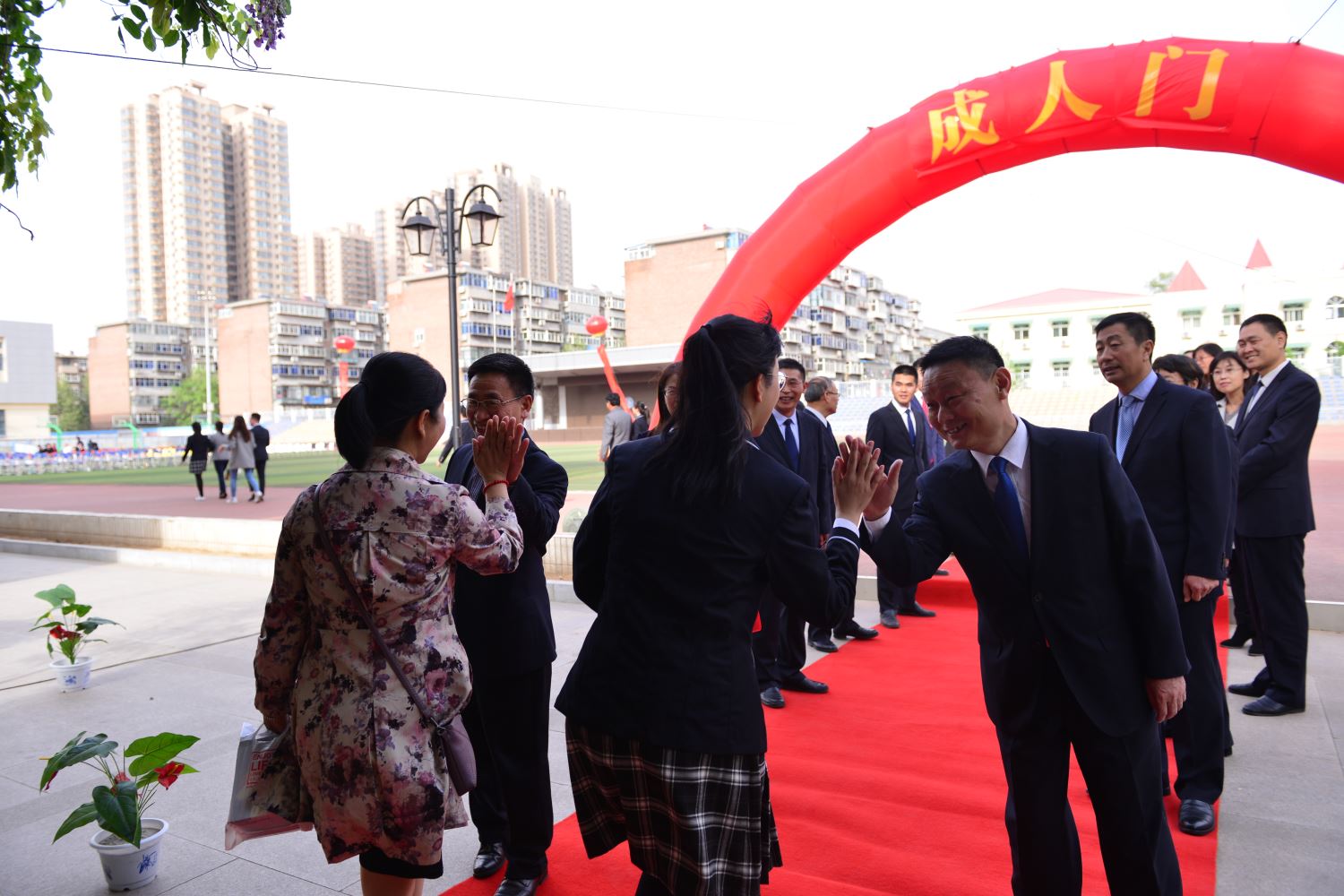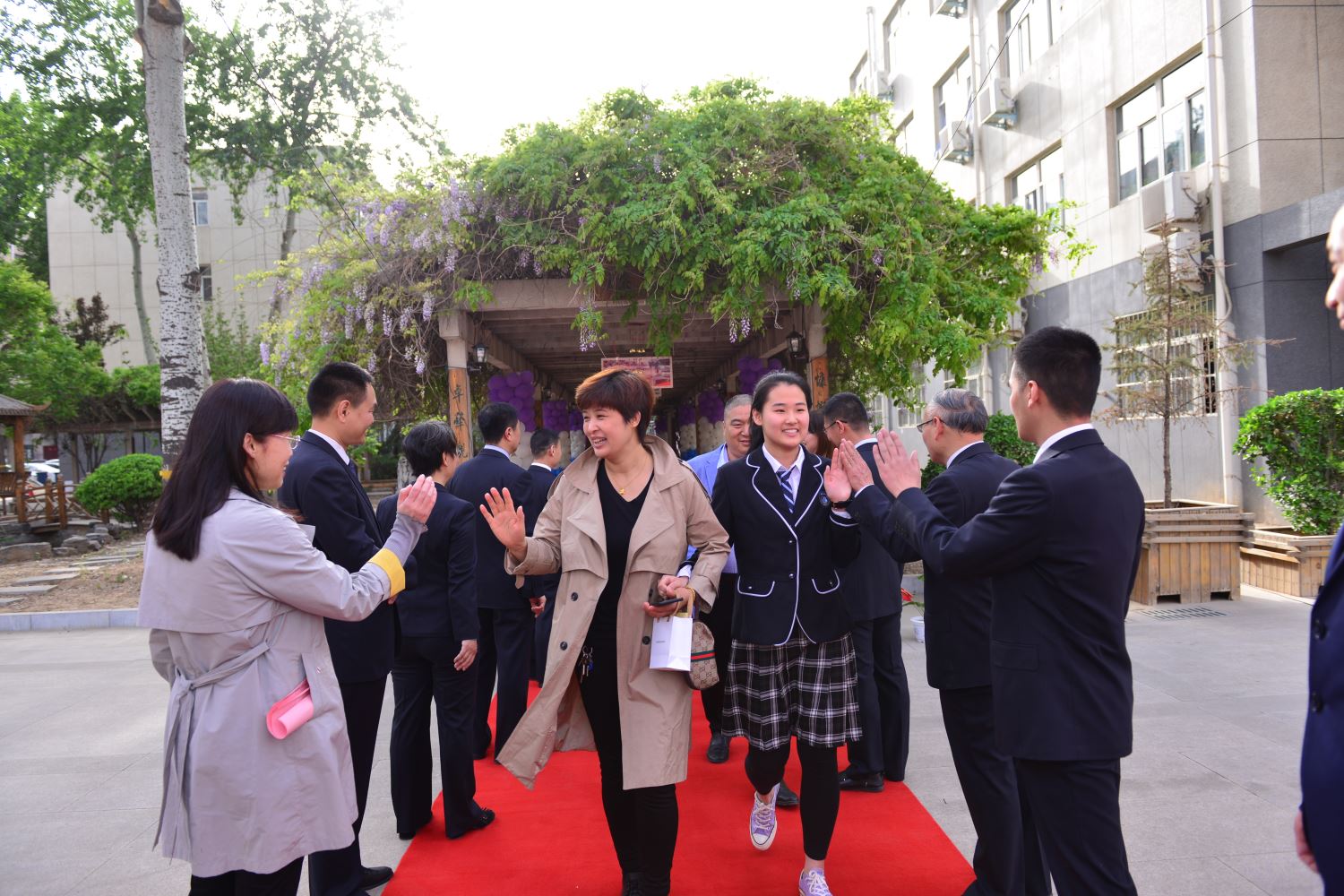 随后,家长牵着孩子的手,一同踏上红地毯,穿过紫藤廊、跨过成人门,一起奔向人生新的起点。学校领导和老师们在成人门两边和同学们一一击掌,庆祝这个激动人心的时刻。
