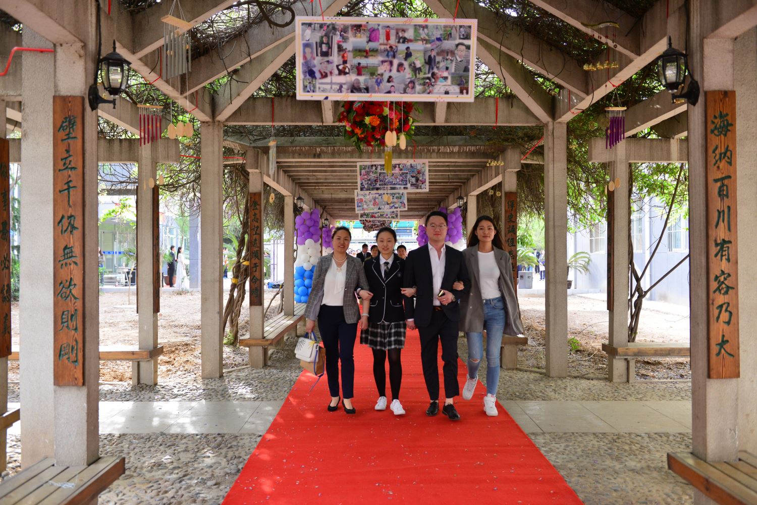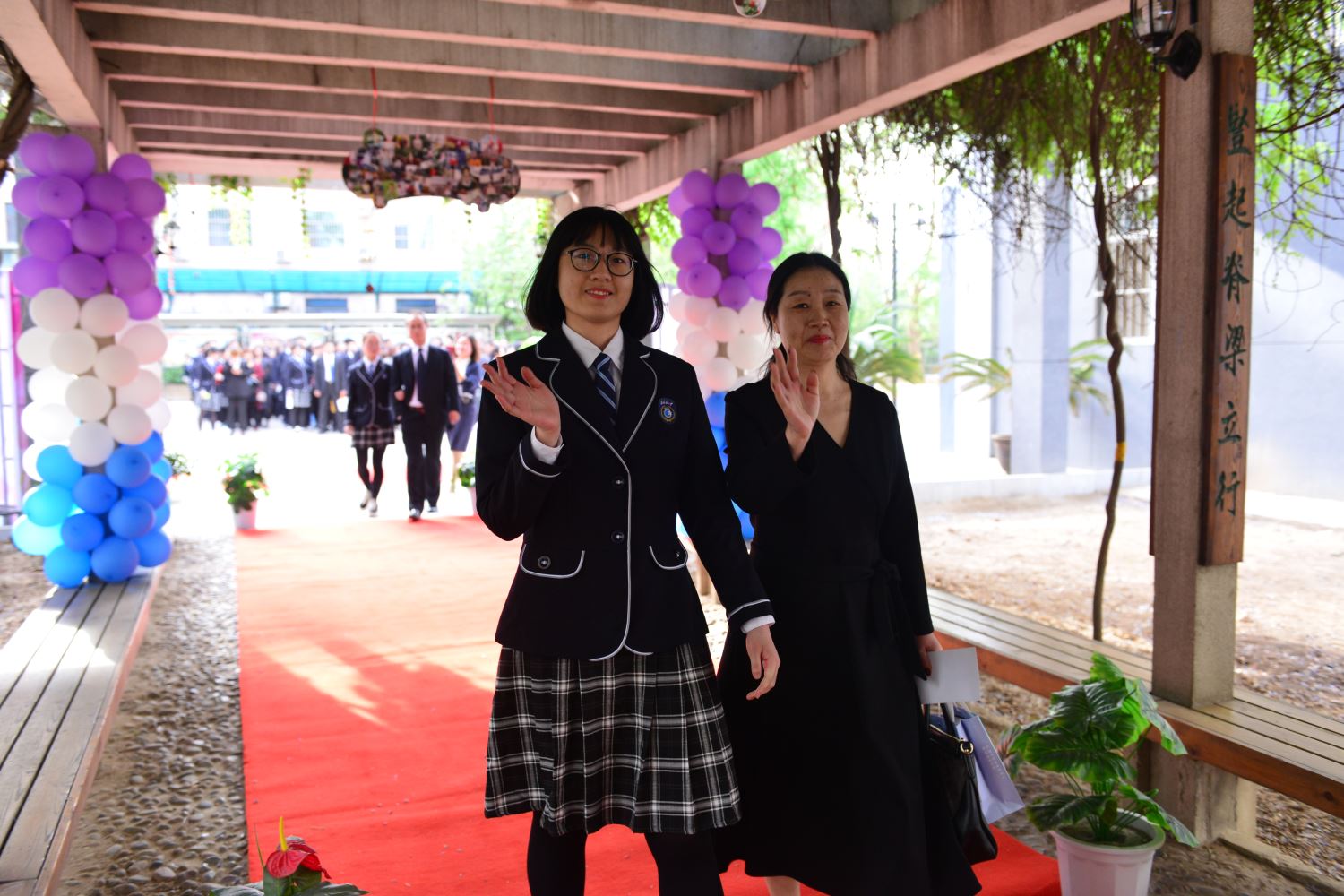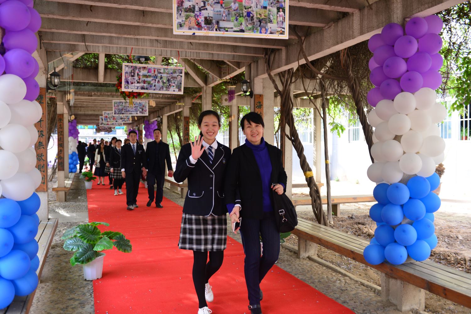 随后,家长牵着孩子的手,一同踏上红地毯,穿过紫藤廊、跨过成人门,一起奔向人生新的起点。学校领导和老师们在成人门两边和同学们一一击掌,庆祝这个激动人心的时刻。