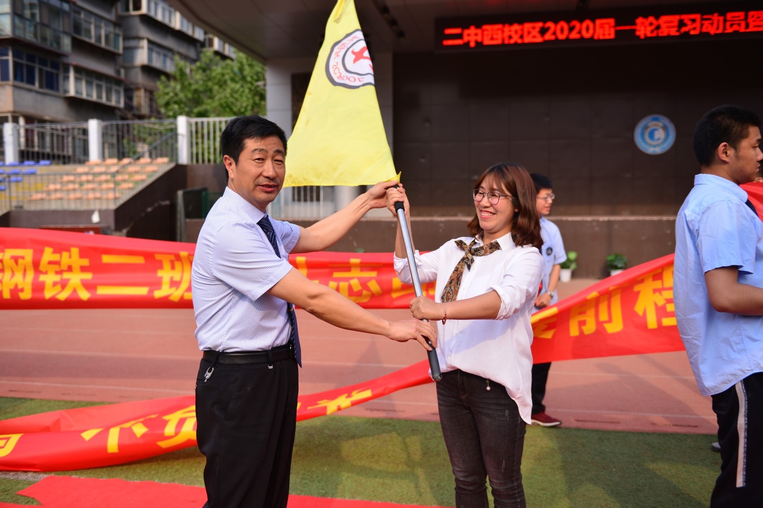 学校领导为各班授旗