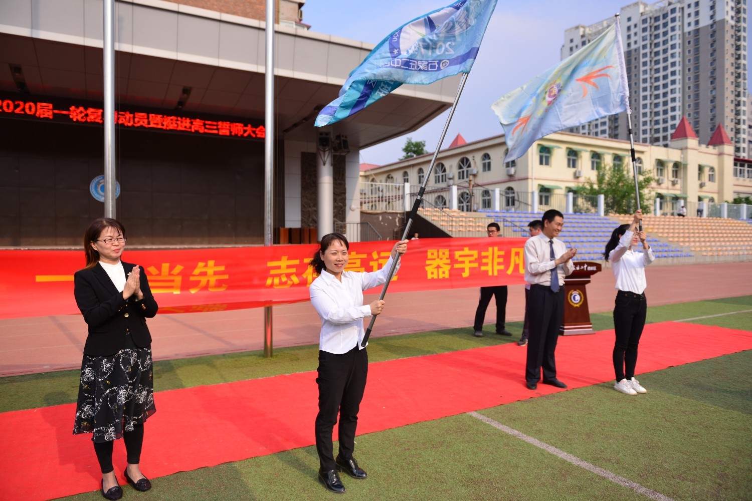 随后,学校领导为四位班主任授班旗,几位班主任面对着熟悉的面孔深情的念出对各位学子的寄语。各班班旗昂扬飘舞,各班口号嘹亮激越,声音响彻云霄,每一声口号中都是他们的誓言和信念,期待着同学们在高三的道路上走出最美的姿态。
