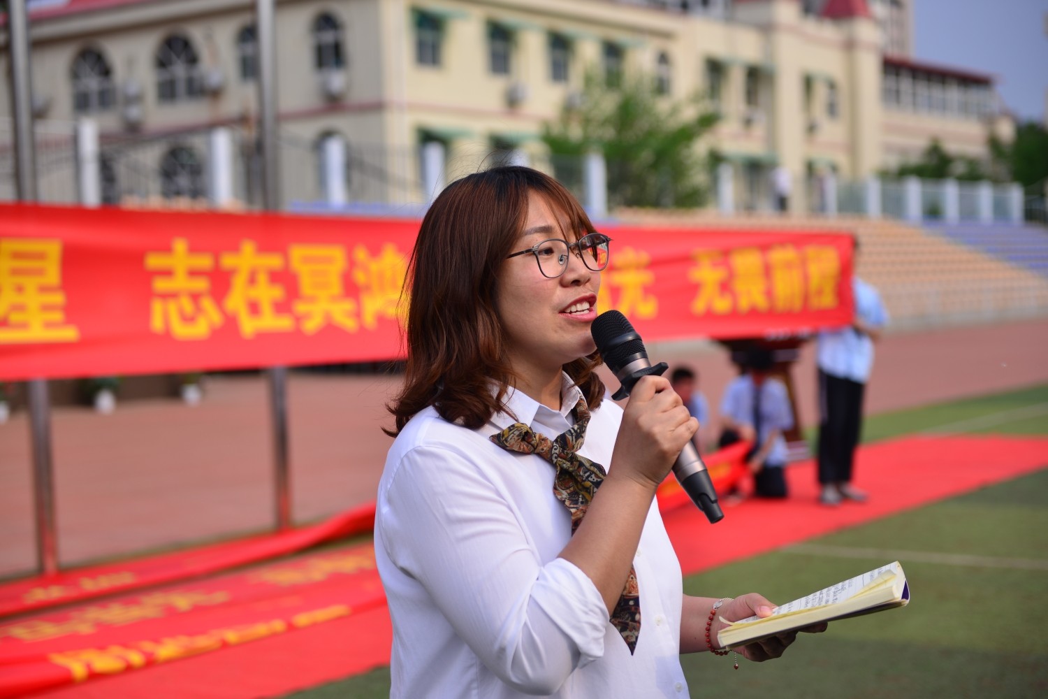 追梦途中,有同学相伴,也有老师相伴。高二年级全体教师进行庄严宣誓,决心用一颗赤诚之心培育祖国栋梁。家长代表燕飞环女士动人的演讲,表达了对孩子们无限的关怀和支持。学生代表王艺蕊同学分享了自己的学习经验,同时向同学们强调了一轮复习的重要性,号召大家无悔青春,努力拼搏,备战一轮复习。