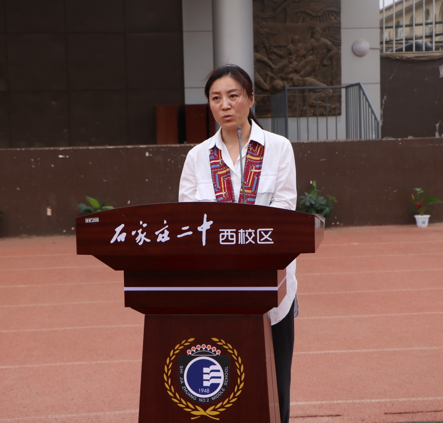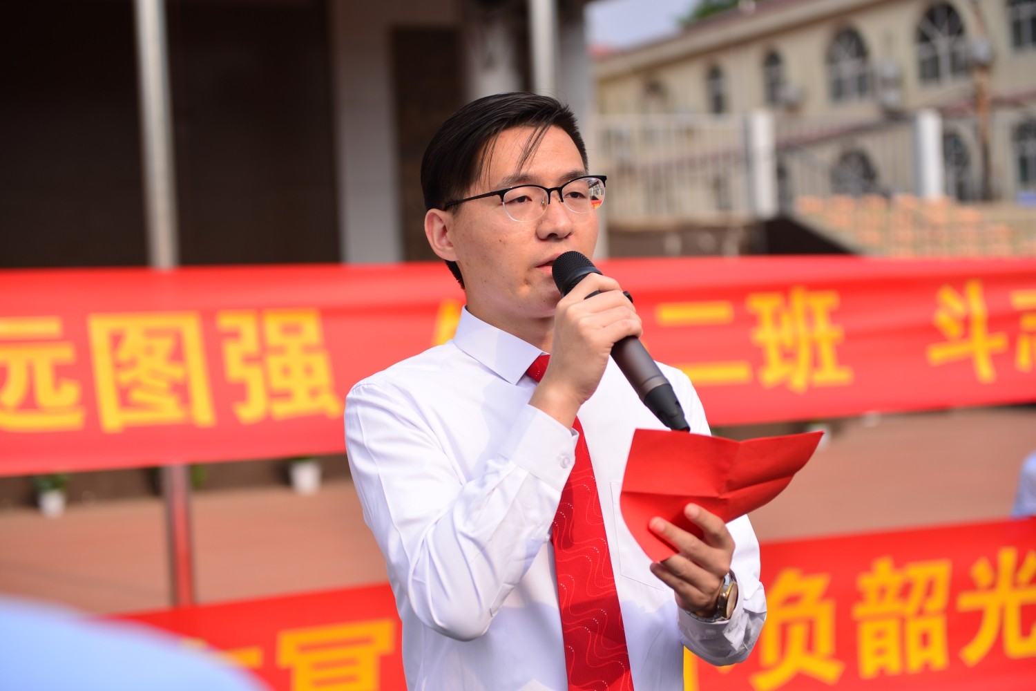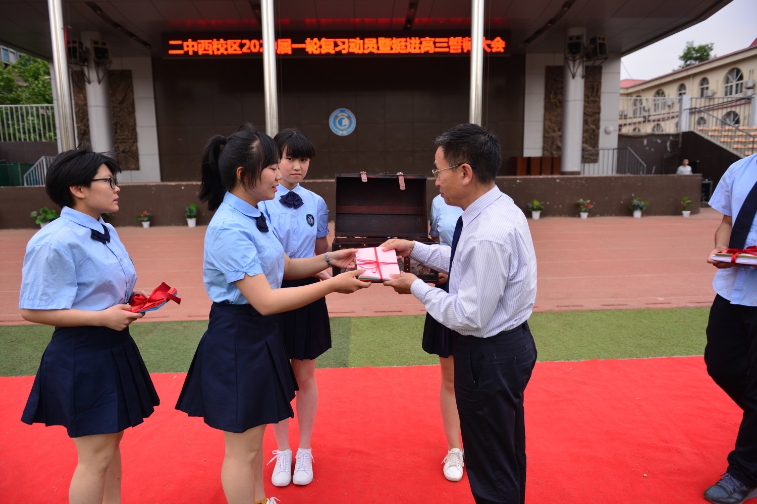 “510”寓意着“我要赢”,大会以学生朗诵《少年中国说》拉开帷幕,在雄壮热烈、饱含激情的青年之声中,吴校长为高二年级授战旗。当吴校长郑重地将大旗交到高二年级时,全体师生都感到了学校的期望和肩上的重任。高二年级郝金亮主任发表了一轮复习总动员的精彩讲话,给同学们提出了具体的要求和热切的期待,强调一轮复习是吹响高三的号角,鼓励大家为了梦想砥砺前行,誓夺明年高考新胜利。