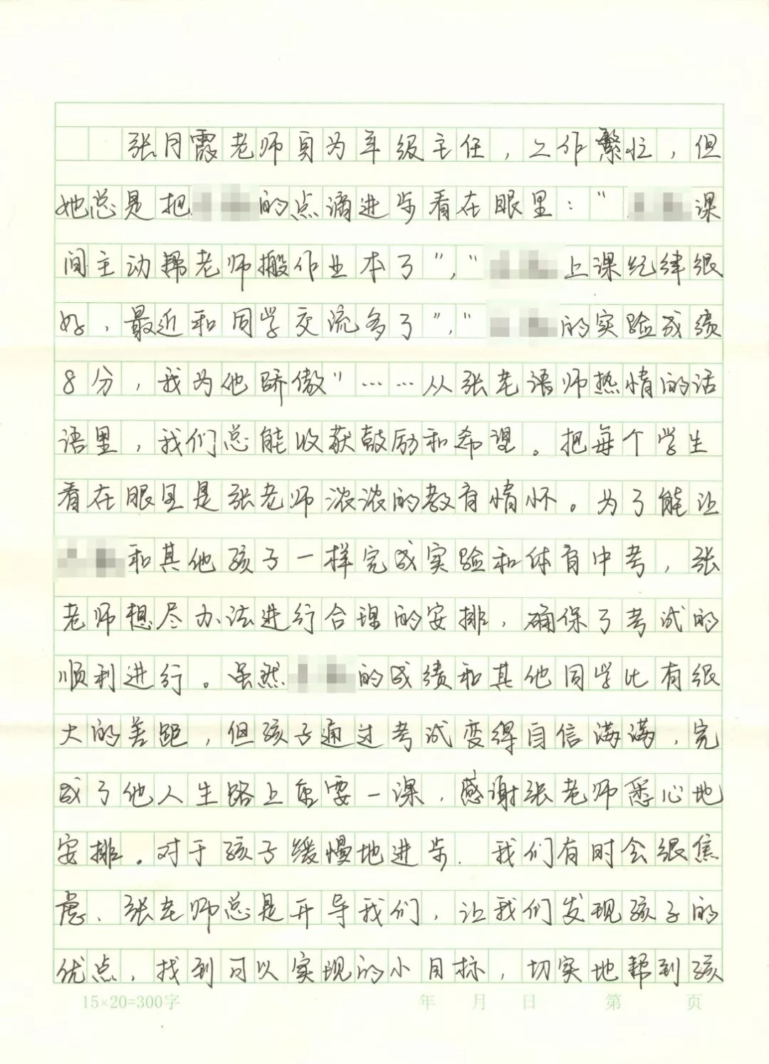 张月霞老师身为年级主任,工作繁忙,但她总是把孩子的点滴进步看在眼里:“小刚课间主动帮老师搬作业本了”“小刚上课纪律好,最近和同学交流多了”“小刚的实验成绩8分,我为他骄傲…从张老师热情的话语里,我们总能收获鼓励和希望。把每个学生看在眼里是张老师浓浓的教育情怀。为了能使小刚和其他孩子一样完成实验和体育中考,张老师想尽办法进行合理的安排,确保了考试的顺利进行。虽然小刚的成绩和其他同学有比较大的差距,但孩子通过考试变得自信满满,完成了他人生路上重要一课,感谢张老师悉心的安排。对于孩子缓慢的进步,我们有时会很焦急,张老师总是开导我们,让我们发现孩子的优点,找到可以实现的小目标,切实地帮到孩子。