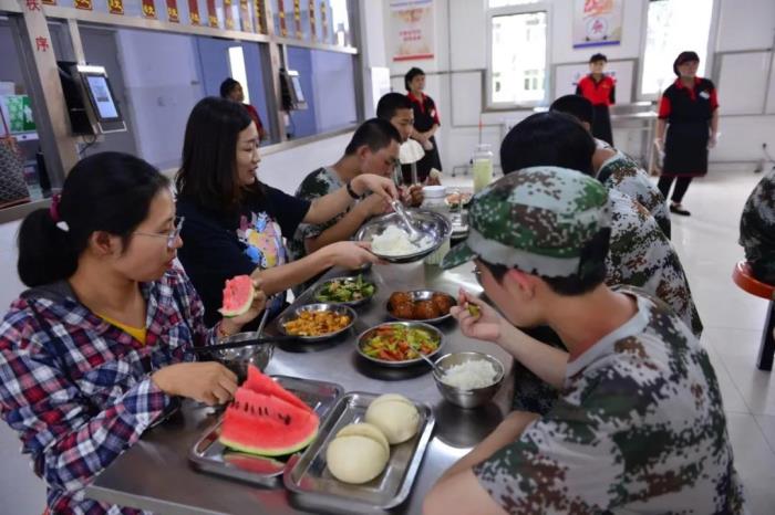 中午,餐厅为同学们准备了丰盛的午餐,保证同学们每天元气满满!年级主任和各班班主任陪着同学们一起就餐,食堂阿姨热心体贴地为大家递上西瓜和菜汤,让孩子们心中多了一份温暖。