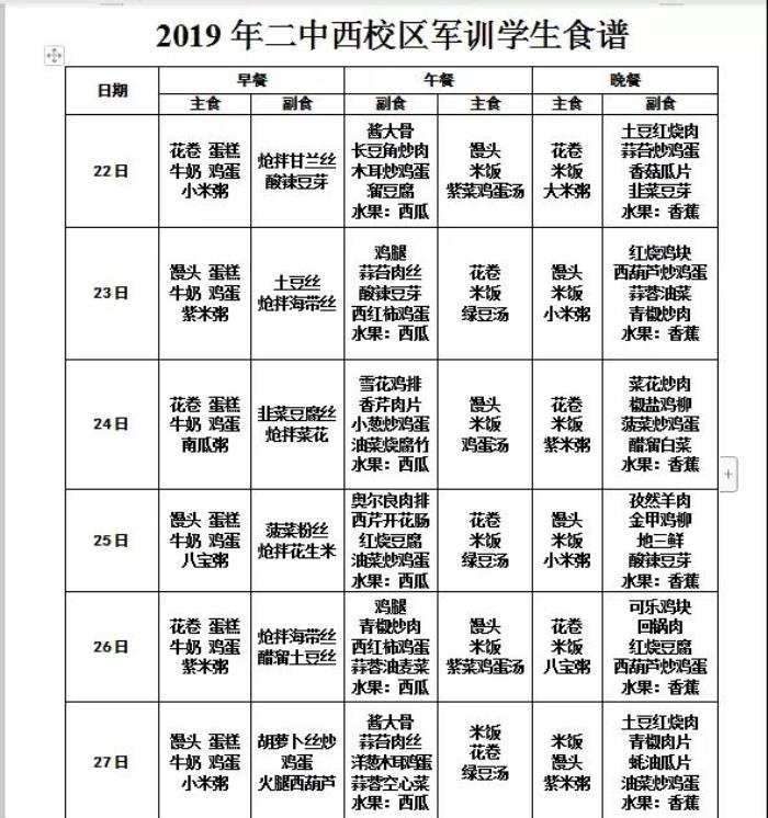 亮点来了!最后,放上一张军训期间的部分食谱!