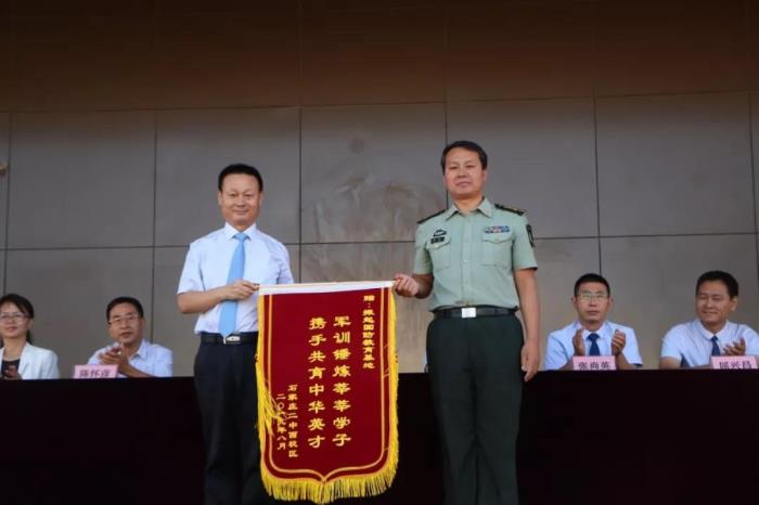 接着,振起国防教育基地白峰主任发言,赞扬了同学们在训练中的表现,并送上美好的祝福。吴进校校长向承训单位赠送锦旗,同学们用热烈的掌声表达对教官最衷心的感谢。