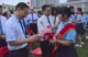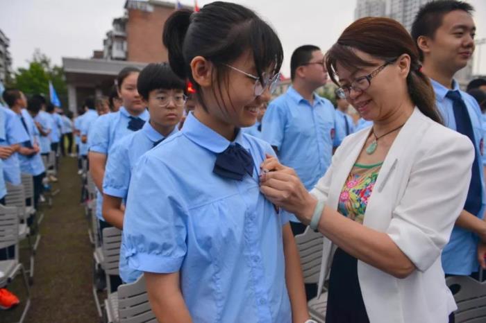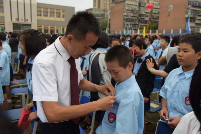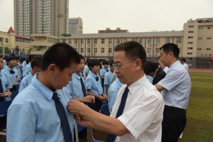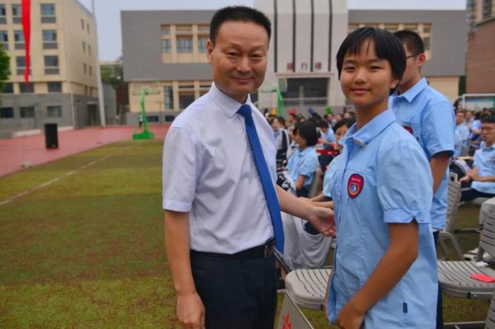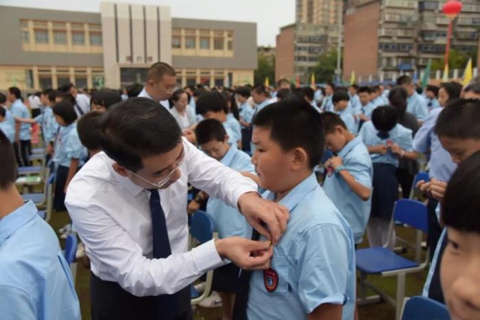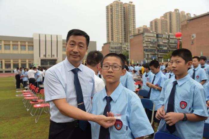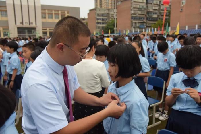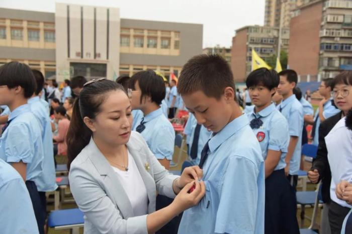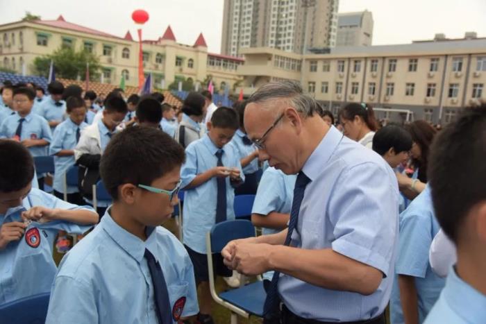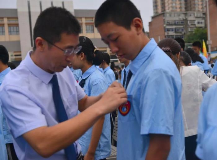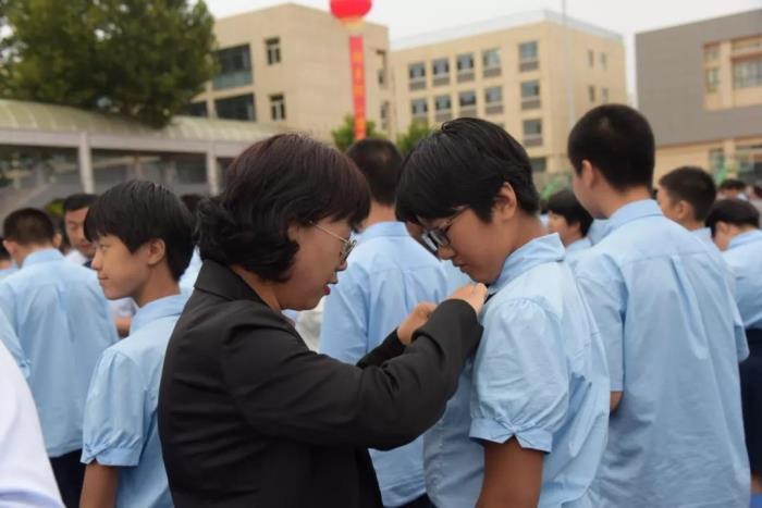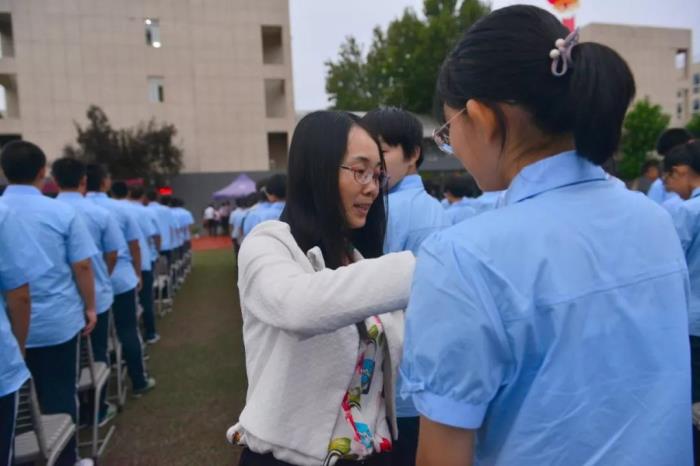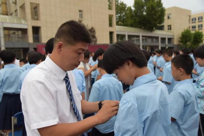 校徽是学校文化魅力展示的名片,是二中学子重要的身份象征。一枚小小的校徽,包含着自豪、荣耀,更有对母校的归属之情。学校领导走向新生,为他们佩戴校徽。