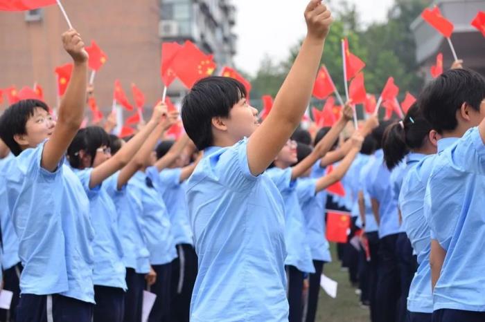 同学们挥舞着小国旗,表达他们强烈的爱国之情