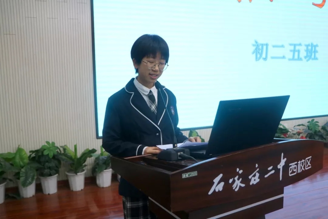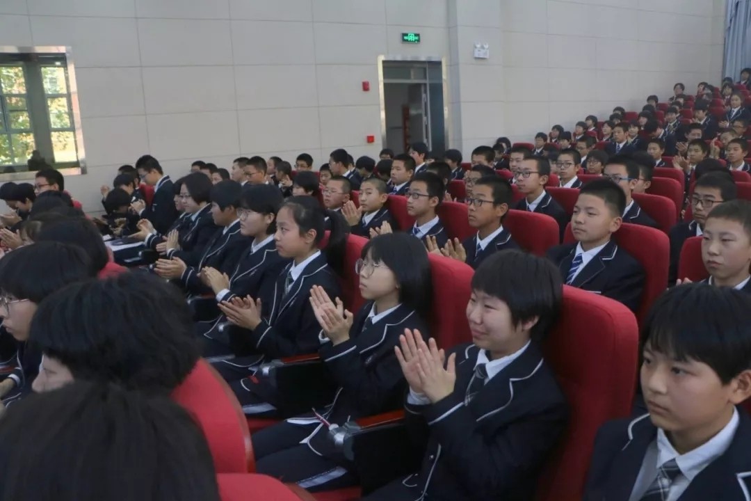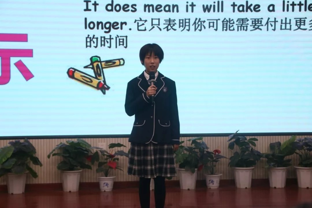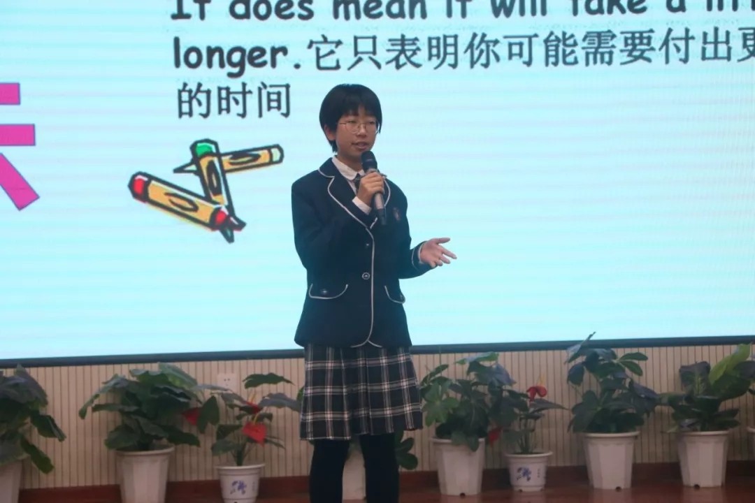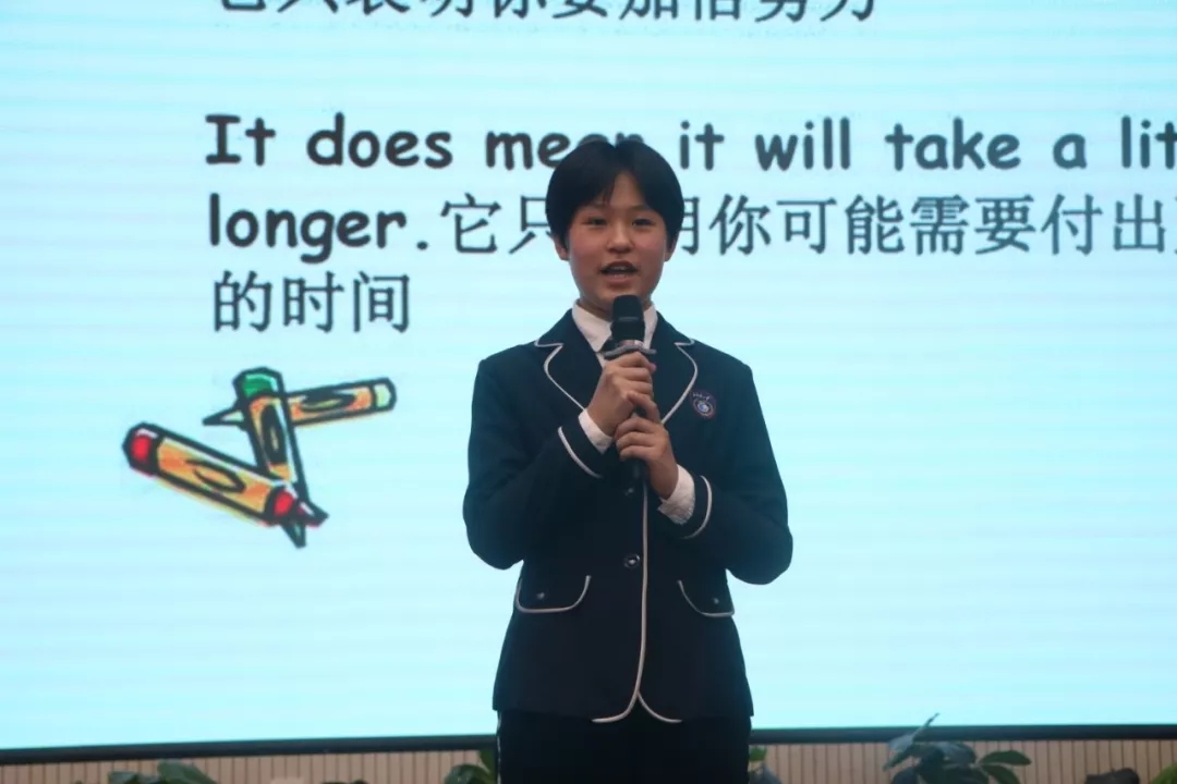颁奖仪式后,优秀学生代表初二5班徐一宁同学向大家分享学习经验。十月份的初中英语口语演讲比赛中脱颖而出的初二5班徐一宁、初二6班刘以清、崔可昕等几位同学上台展示风彩。