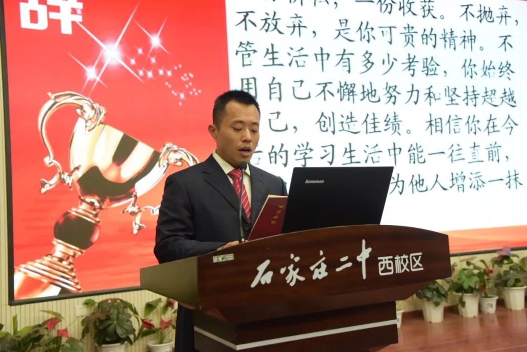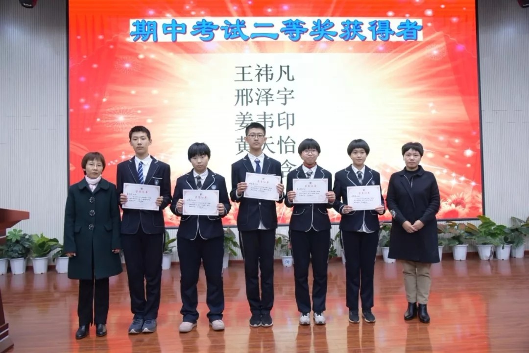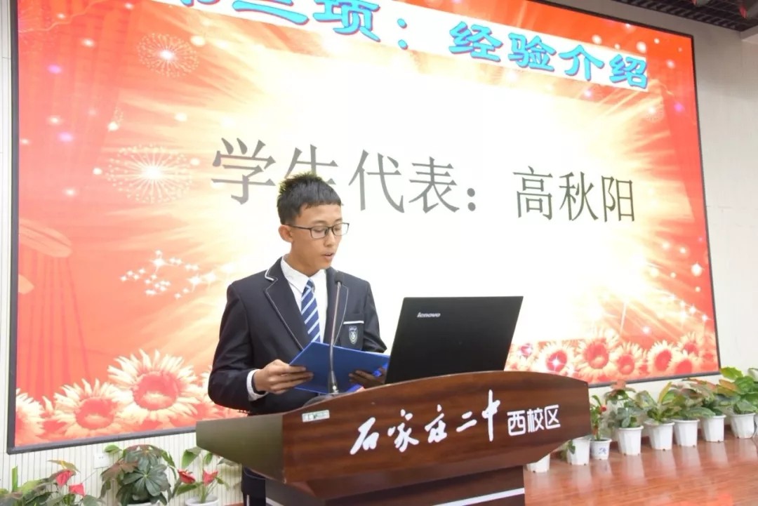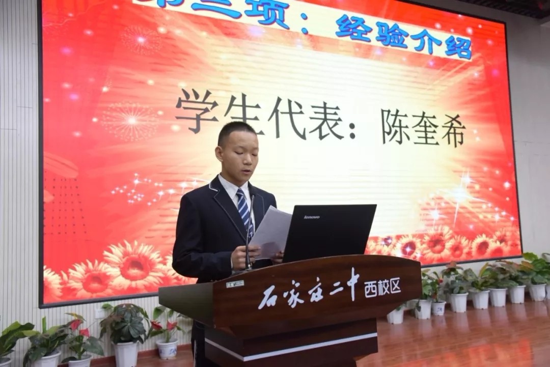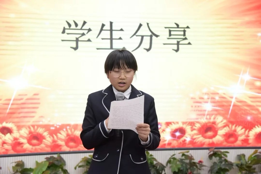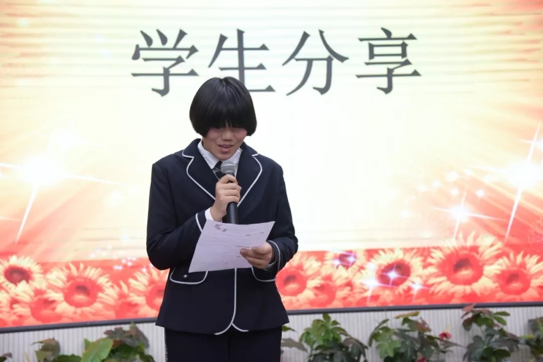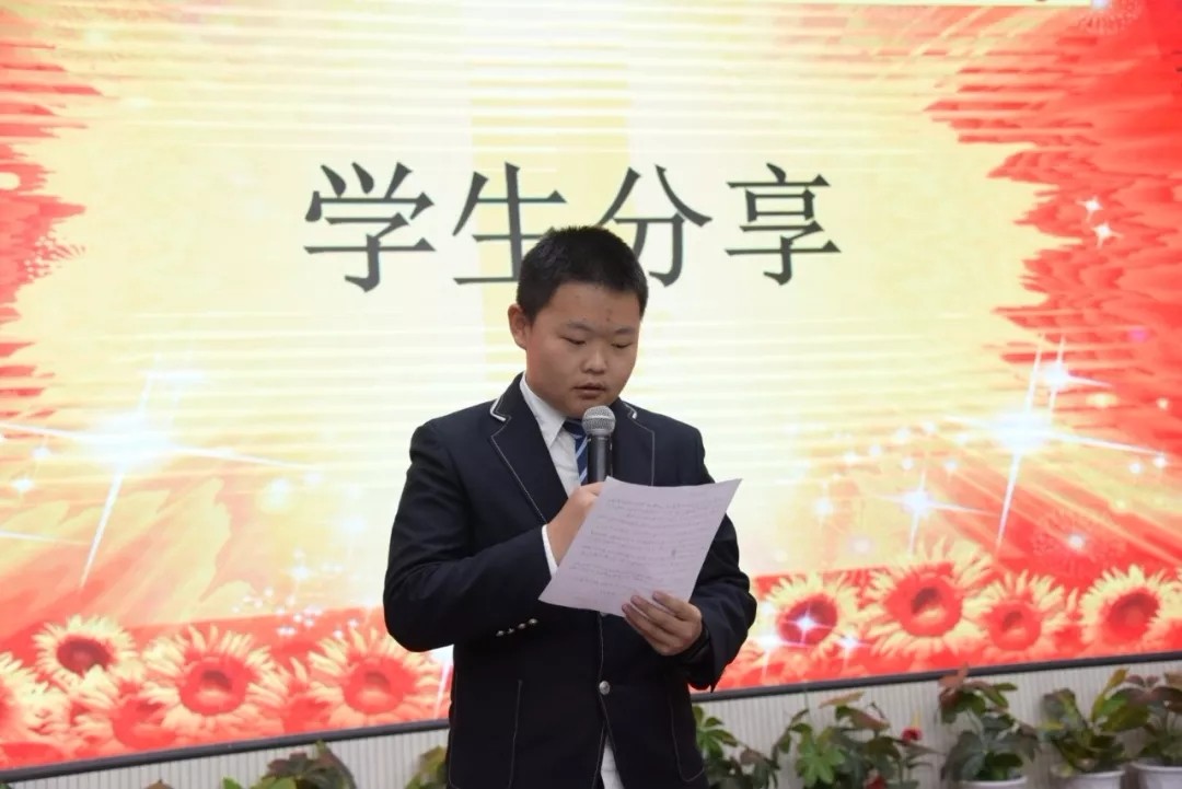 年级主任杨萍讲话,对学生提出了殷切期望,并希望同学们在接受掌声和祝贺时,在以后的学习中更加严格要求自己。考试中成绩优异的高秋阳同学、进步显著的陈奎希同学做精彩发言,给同学传经送宝,学习经验的分享,让“学霸”不再成为神话,让同学对学习充满信心。随后,现场抽中的幸运同学分享考后反思,让反思成为学习的思维常态。