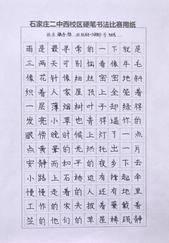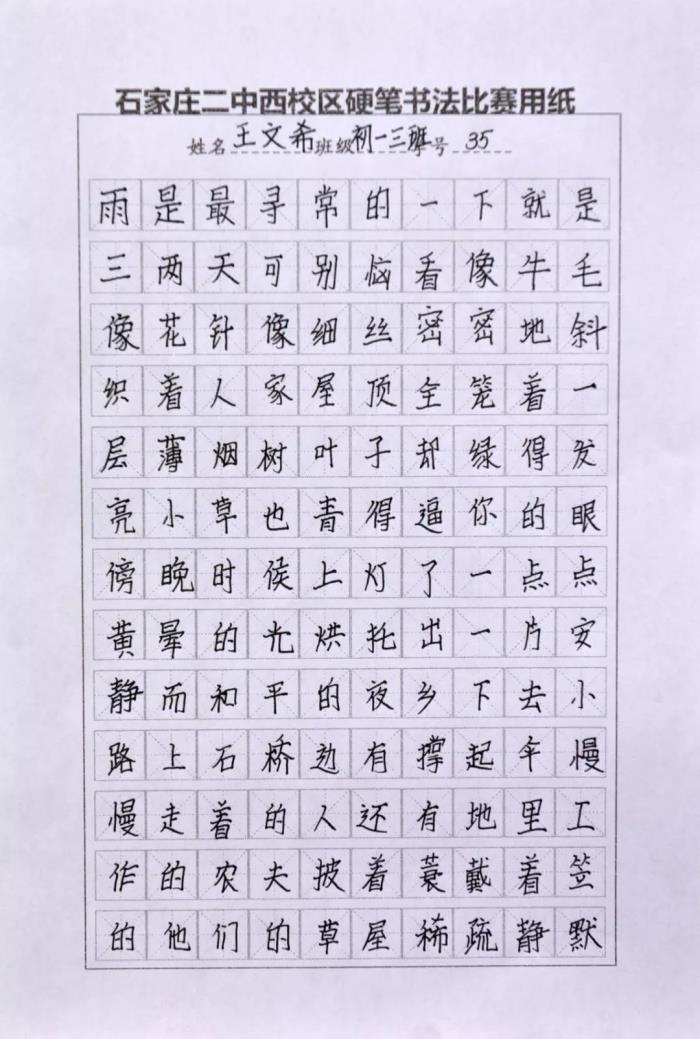 本次活动,年级主任广泛动员,班主任们积极组织,所有学生全员参与。 活动中,同学们全神贯注,平心静气,一丝不苟,尽情享受着书写的乐趣。最后的作品字迹流畅端正,卷面整洁漂亮,令人赏心悦目。