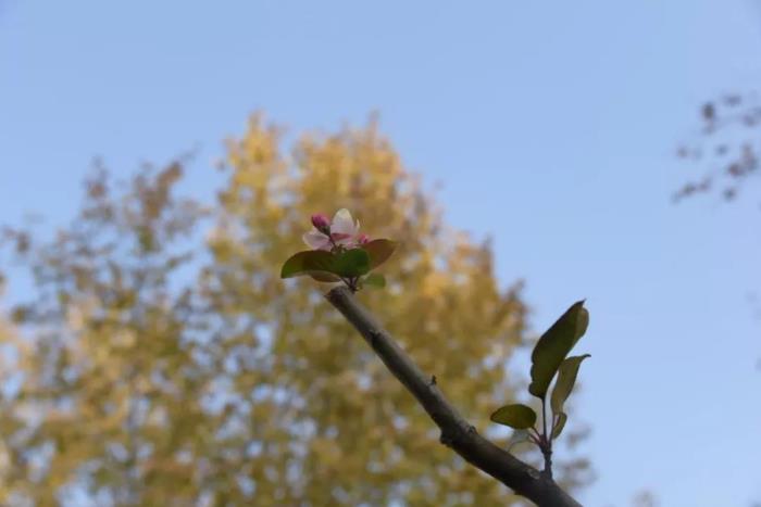 初冬以至,海棠依旧。不管是雨疏风骤,还是风雪交加,依旧改变不了海棠的绽放。
