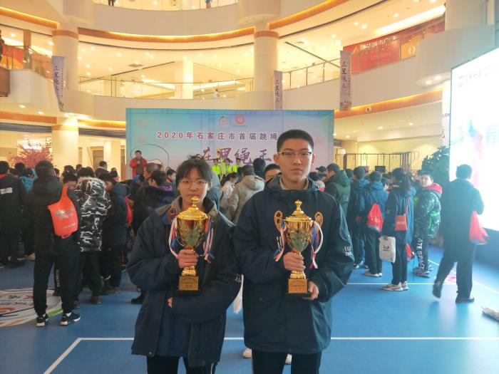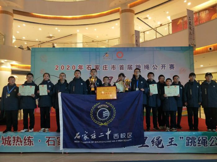 早上9点,伴随着激情嘹亮的国歌,我校跳绳队的同学们出现在公开赛的赛场上,跨栏名将史冬 鹏作为石家庄市跳绳运动协会副会长也来为活动助力。比赛分为成年组、青年组、少年组、儿童甲组、儿童乙组、幼儿组共计6个组别,设置个人竞赛、集体速度竞赛、花样赛 、社会友谊赛四大类共计10个竞赛项目。我校初中年级组成的16人团队获得10人集体1分钟同步调、10人集体3分钟八字跳两 项冠军,并获得优秀组织奖!同学们手里拿着印有吉祥物“盈盈”的奖牌,就是他们用自己的努力和热爱赢得的2020年最好的 礼物。