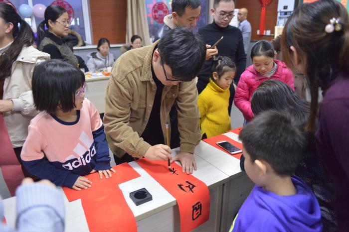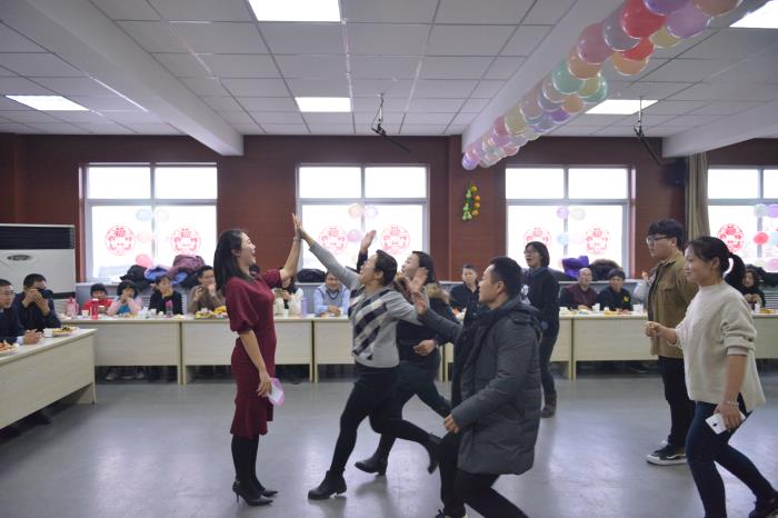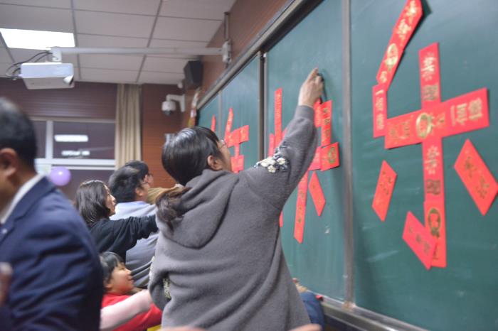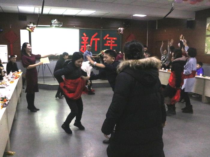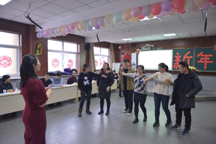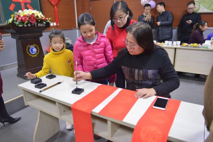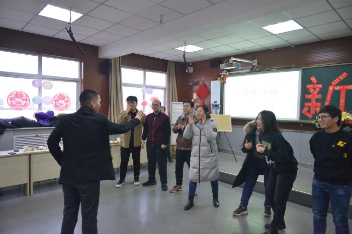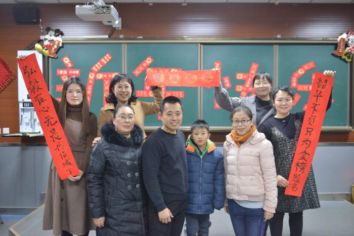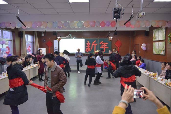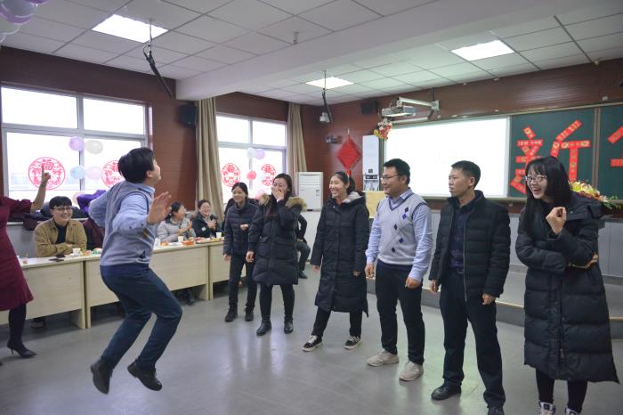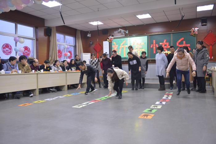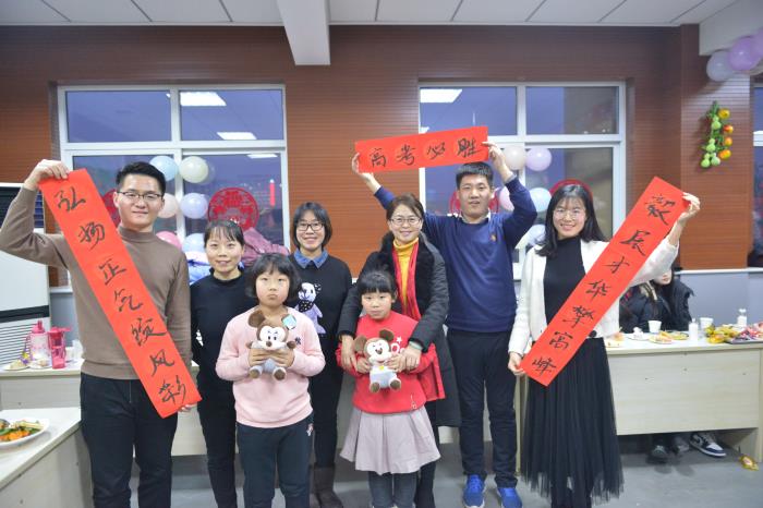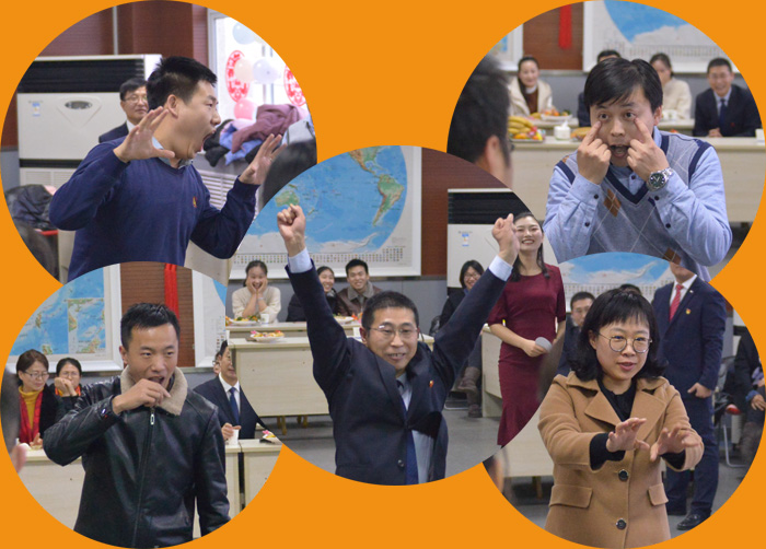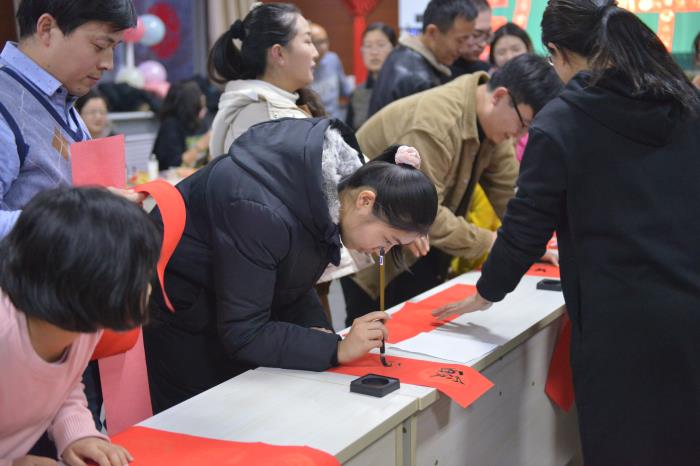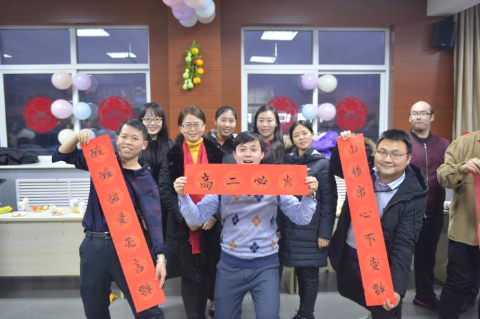 联欢伊始,首先上映了学生们精心为老班制作的祝福大片,虽然每个班时间有限,但各个新意百出,温情满满。随后团拜会在教育处杨雅杰老师的潺潺歌声中开启了游戏环节,老师们在开门大吉、默契考验、传宗接带、手脚不同等一个个创意无限的互动游戏中,尽情绽放,忘却疲惫,大家欢声笑语,其乐融融。在温馨、愉快的气氛中,将团拜会推向高潮。最后各个级组挥毫泼墨,现场书写了新春对联,纷纷献上新年诚挚的祝福。