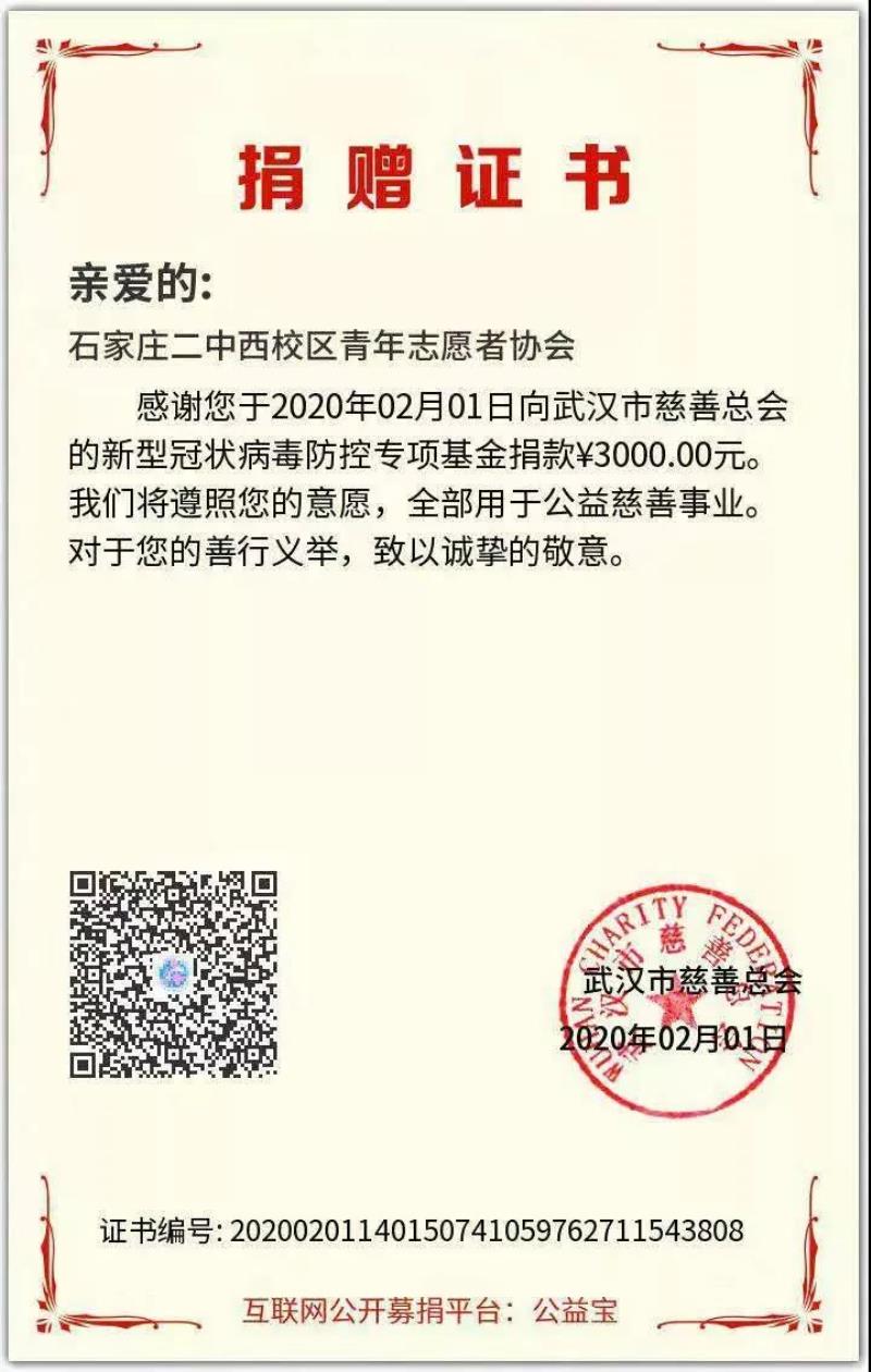 面对来势汹汹的疫情,在教育处和校团委的号召下,石家庄二中西校区青年志愿者协会成员自发募捐,向武汉市慈善总会捐款3000元,体现了我校学子的责任和担当。