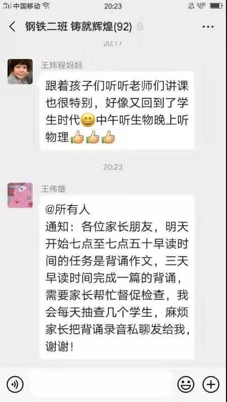 各班班主任全天候在线,和家长密切沟通,让学生每天按时打卡,保证他们按照作息时间表,科学有效地学习和休息,同时监测学生的健康状况,为每一位学生负责。教务处、电教组为老师们提供了强大的技术支持,确保“停课不停教,停课不停学”得以有效实施。