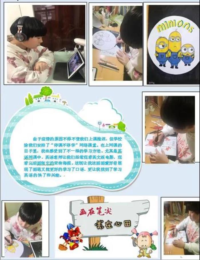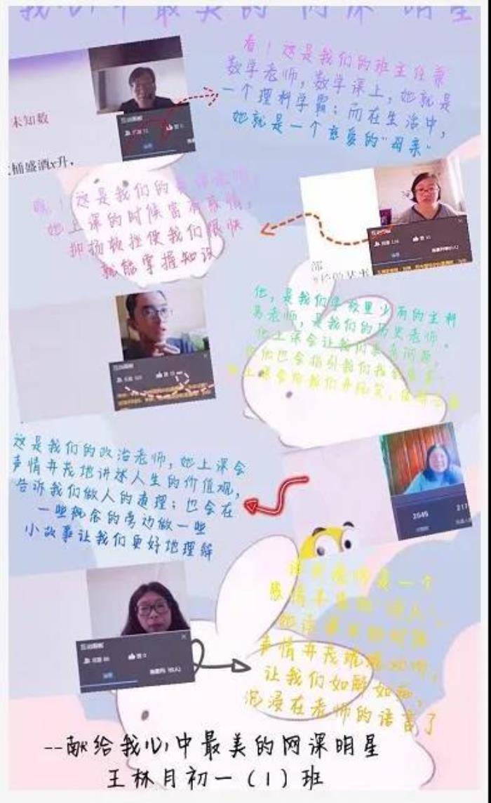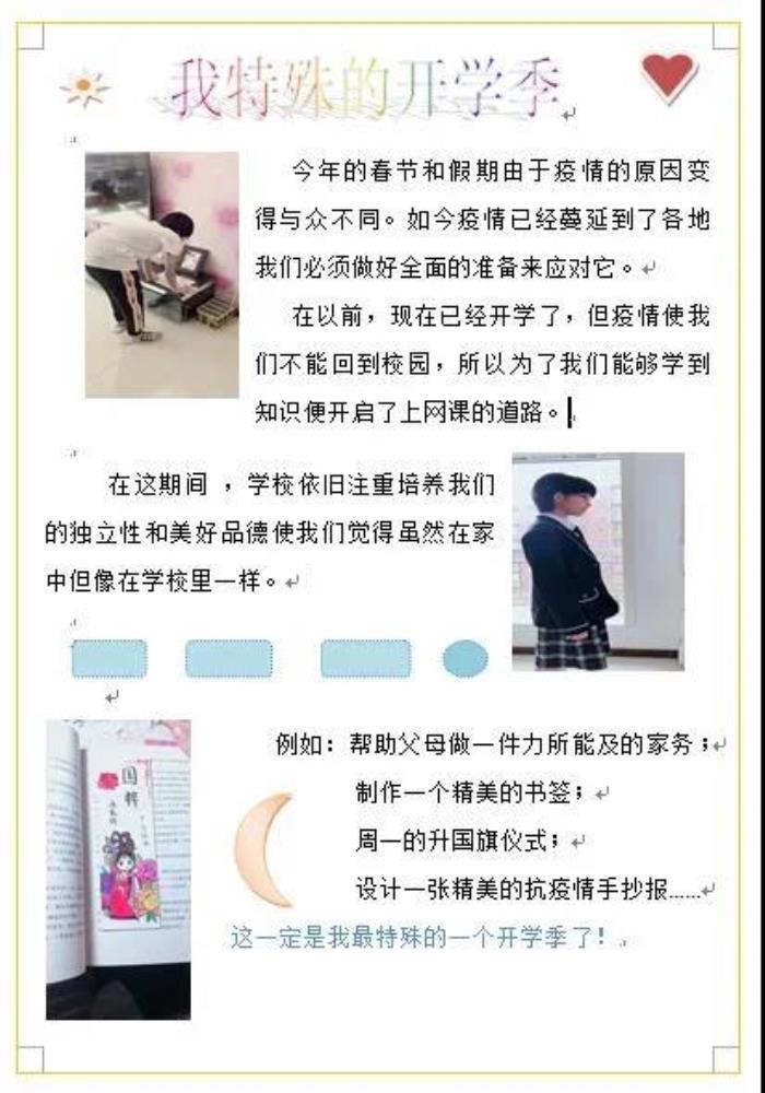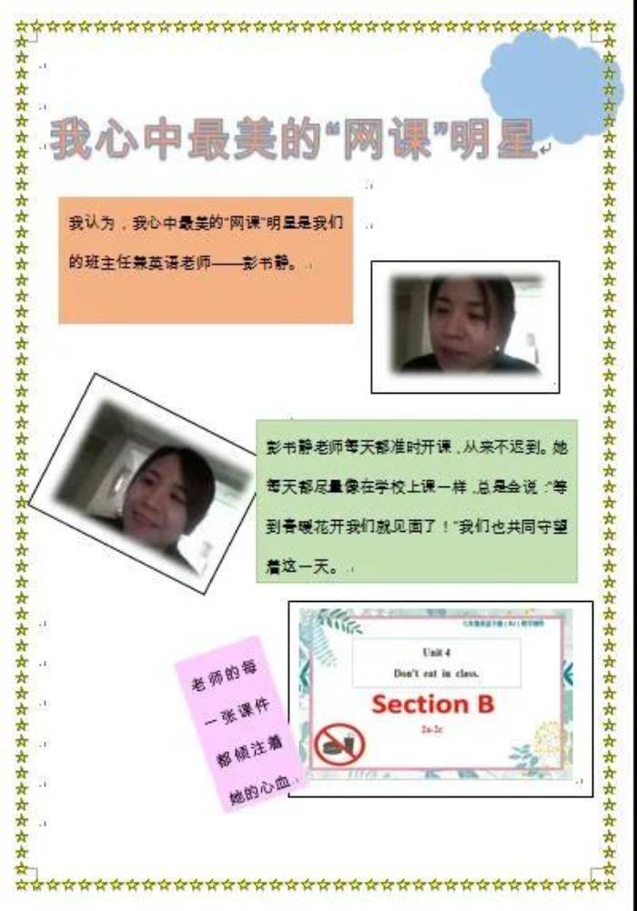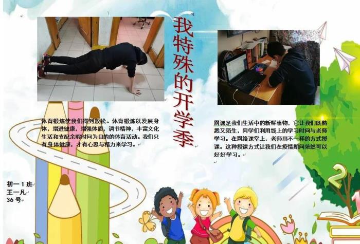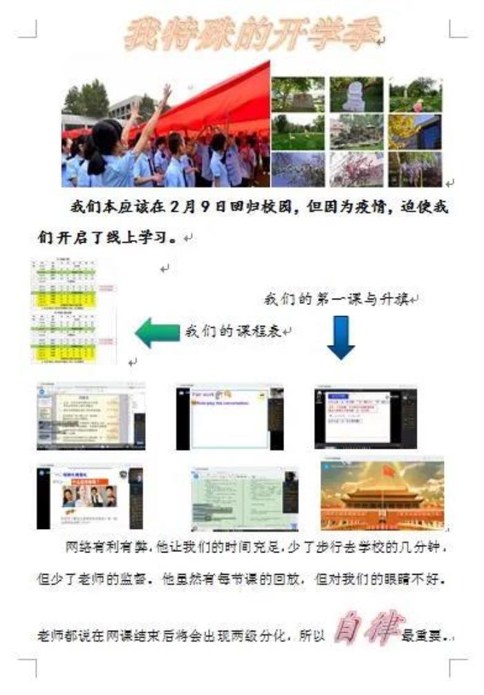 在吴世杰主任、信息技术组刘洋老师及全体班主任老师的统一安排、精心组织下,初一年级的同学们充分发掘网课学习素材,利用Word软件进行电子报的制作,详实地记录下自己在家在线学习、休闲、娱乐等日常生活的精彩瞬间。因条件所限无法进行Word电子报制作的同学,把自己老师精心教学的美好形象、动人瞬间制作成了“海报”积极为自己的老师打CALL。 本次制作活动不仅提升了同学们的学科素养、巩固了学科知识,也为自己珍藏下“网课”学习这段终生难忘的特殊记忆!