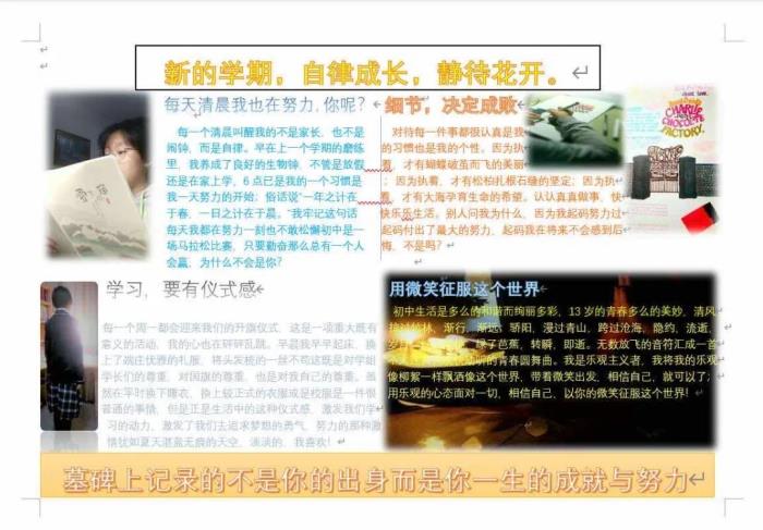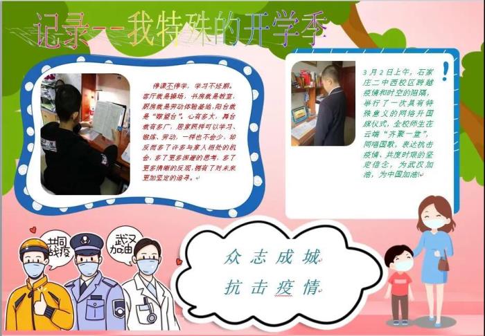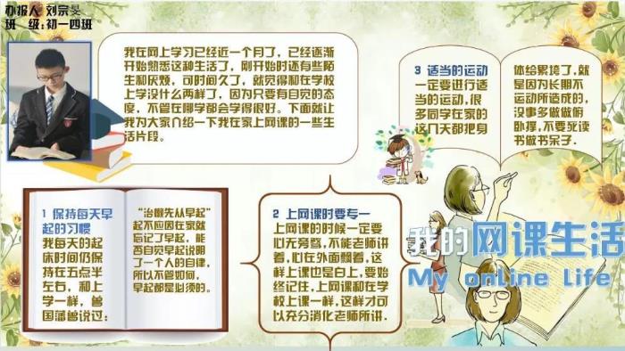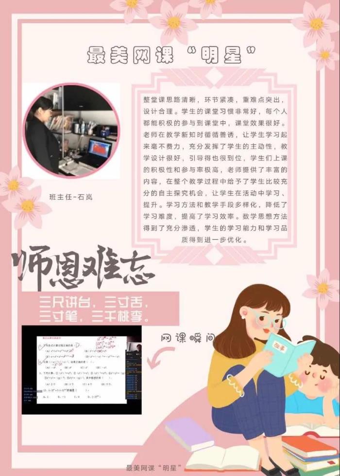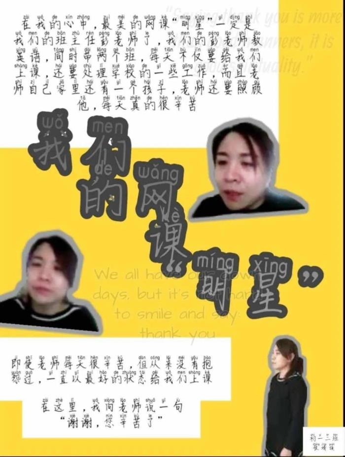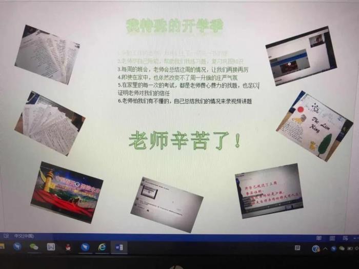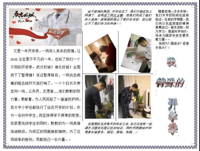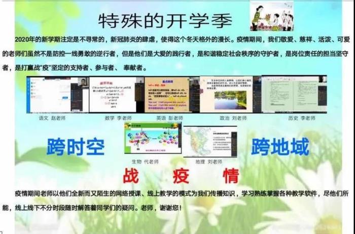 在吴世杰主任、信息技术组刘洋老师及全体班主任老师的统一安排、精心组织下,初一年级的同学们充分发掘网课学习素材,利用Word软件进行电子报的制作,详实地记录下自己在家在线学习、休闲、娱乐等日常生活的精彩瞬间。因条件所限无法进行Word电子报制作的同学,把自己老师精心教学的美好形象、动人瞬间制作成了“海报”积极为自己的老师打CALL。 本次制作活动不仅提升了同学们的学科素养、巩固了学科知识,也为自己珍藏下“网课”学习这段终生难忘的特殊记忆!