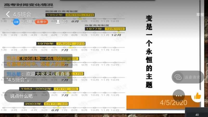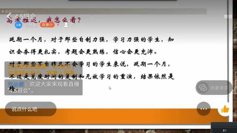 2020年的打开方式很特别,"停课不停学“在线网络教育活动给毕业班工作增添了不确定性。同时,高考延期的重磅消息也对高三学子的心理产生了不小的影响。面对高考延期,高三学生如何完善复习计划、如何调整心态高效备考?针对高三学生普遍反应的这些问题,我校高三年级四位班主任召开题为“战斗者无惧,自律者恒强”的主题班会,来引导高三学子正确面对高考延期的新形势,保证高三学子的学习节奏和状态。