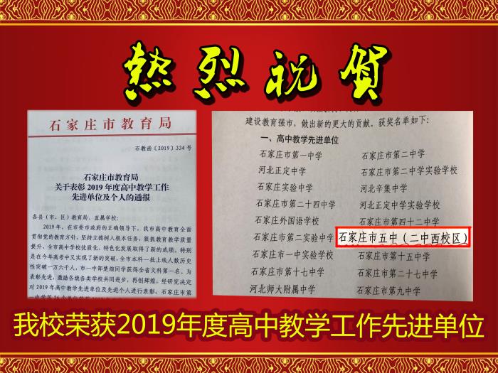 为了表彰先进,激励全市高中学校再创辉煌,近日,石家庄教育局评选出了2019年高中教学先进单位及个人。其中, 二中西校区获得“高中教学先进单位”称号,理综备课组被授予“先进备课组”称号。教务处常乐主任、年级邢玉彬主任获得高中教学(管理)先进个人称号。