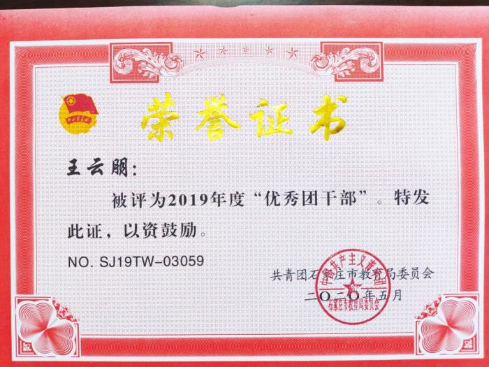 近日,我校团委被评为2019年度“红旗团委”,王云朋老师被评为“优秀团干部”。特此表示祝贺!