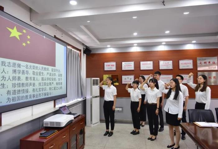 仪式伊始,樊茹副校长宣读师徒结对名单,并对八位新教师提出了殷切期盼。她叮嘱年轻教师,一定要树立奉献教育事业的理想信念,保持热情向上的劲头。各位老师要紧紧围绕“熟悉、学习、思考”三个关键点,适应工作岗位,进入工作角色。培训要以核心素养为指导,并注重教学实践。接着,在几位新教师做了个性化的自我介绍,韩佳萍老师作为新教师代表进行发言。她说,要用亲和之心架设教育之桥,用无私之心铺就事业之路,用研究者之心搭建教学之梯。这不仅是各位教师的肺腑之言,更是今后教学任务中的引路标杆。随后,八位新教师面对国旗庄严宣誓,铿锵有力、掷地有声的话语,表现了他们成为一名光荣的人民教师的自豪与骄傲。