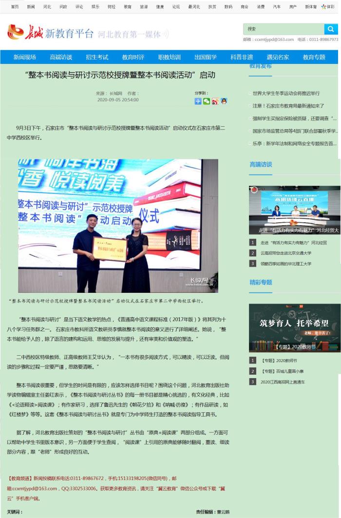长城网:“整本书阅读与研讨示范校授牌暨整本书阅读活动”启动