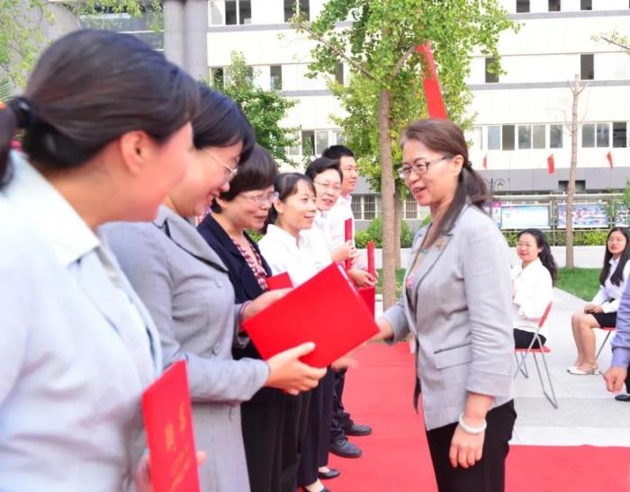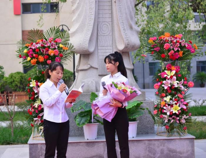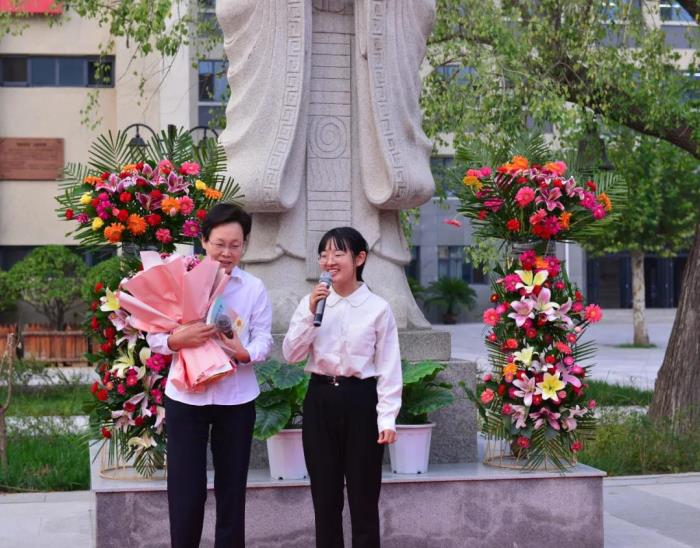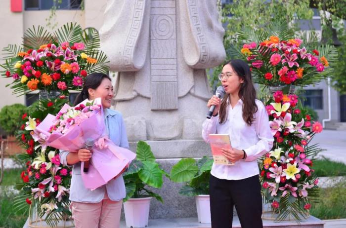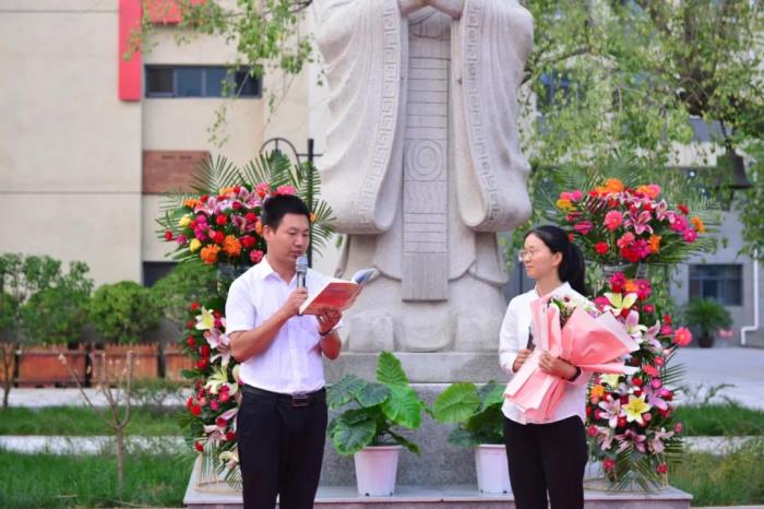 陈怀彦书记宣读师徒名单,樊茹副校长颁发了聘书。随后,徒弟行拜师礼,向老教师鞠躬致意。各位师傅向徒弟赠送《早起的奇迹》一书,并向徒弟送出殷切的寄语。徒弟向师傅献花,并郑重表态。各位教师齐诵《中华成语千句文》,感受中华民族尊师重教的传统和先贤孔子伟大的精神。