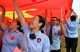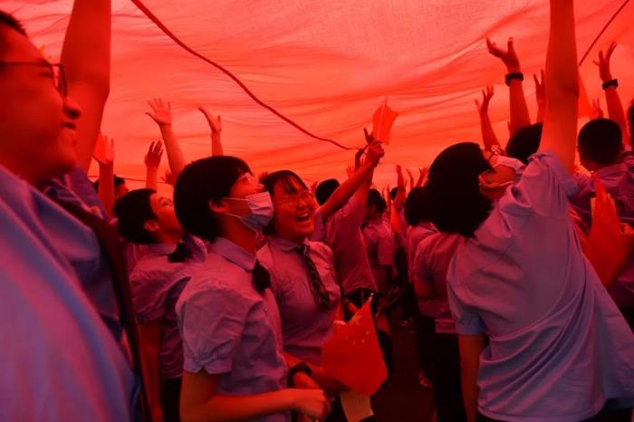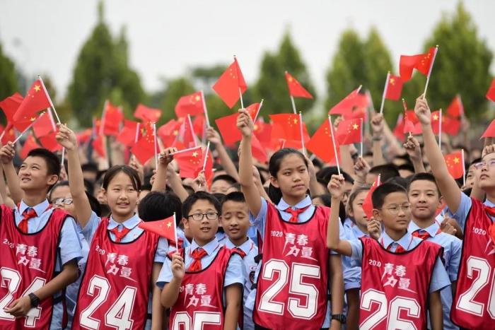 同学们挥舞手中的国旗,表达他们浓浓的爱国情