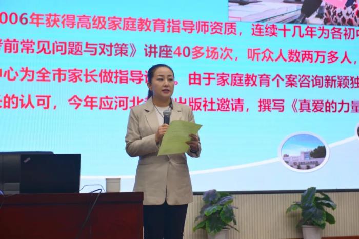 张金素老师为石家庄二中本部校长助理、教育处主任,高级家庭教育指导师,曾获得河北省骨干教师、河北省优秀教师等称号。本次讲座主要从家长的责任、家长的目标与困惑、多元智能理论的启示等方面进行了阐述和剖析。张主任告诉家长,问题是成长的台阶,要树立正确的孩子成长观;要有静待花开的耐心,理解同情孩子,竭尽智慧和孩子一起走出困境。避免过高期望,过度监督等问题。最后,张主任总结说,孩子就是家长的影子,要做有格局、有思想、有境界的家长,孩子一定会有美好的未来!