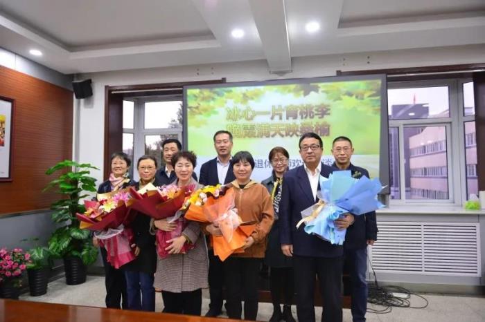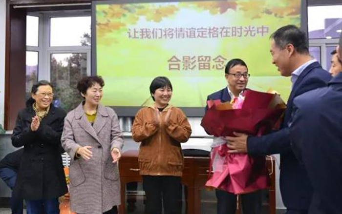 学校领导向退休教师献花