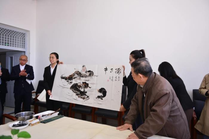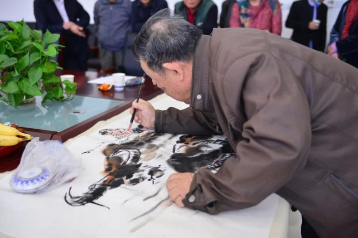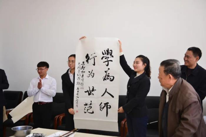 随后,离退老同志向学校青年教师赠送书籍。赵金复老师挥毫泼墨,现场作画《孺子牛》一副,并写下“学为人师,行为世范”几个大字,表达了对我校青年教师的殷切期望。