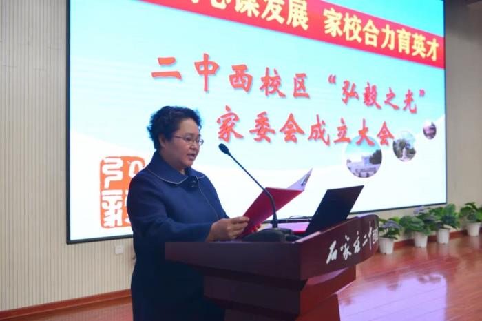 刘建炜主任代表学校宣读《石家庄二中西校区弘毅之光家长委员会第一届委员名单》。我校家长委员会机构设置,分为班级家长委员会——年级家长委员会——校家长委员会三级分支,分别设置会长、副会长、秘书长等职务。