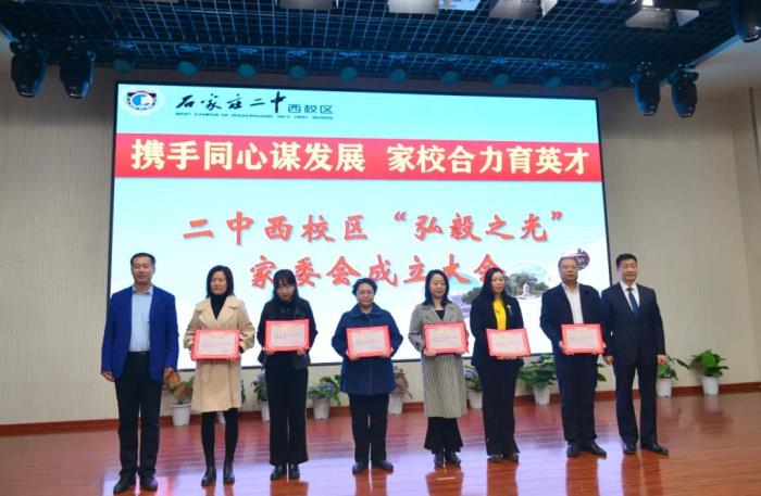校家委会会长杨瑞杰女士、副会长李静女士、秘书长吕丹丹女士、副秘书长刘婕女士、委员张巍女士、董永哲先生上台接受聘任。孙福山校长、张永泽副校长为校级家长委员会成员颁发聘书。校家长委员会会长杨瑞杰女士宣读了《石家庄二中西校区家长委员会章程》。