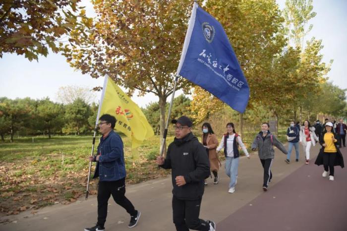 无边秋色尽妖娆,只此秋光胜春潮。伴随着飒爽的秋风,大家来到了叠翠流金的滹沱河生态园。孙福山校长就凝聚士气,鼓舞精神进行了简短讲话,随后带领大家沿生态园观景道路行进了五公里徒步活动,大家迈着矫健的步伐,一路沿河欣赏“秋水共长天一色”的风光,交流生活工作中的酸甜苦辣,也深深感受到了从历史深处奔涌而来的滹沱河文化。