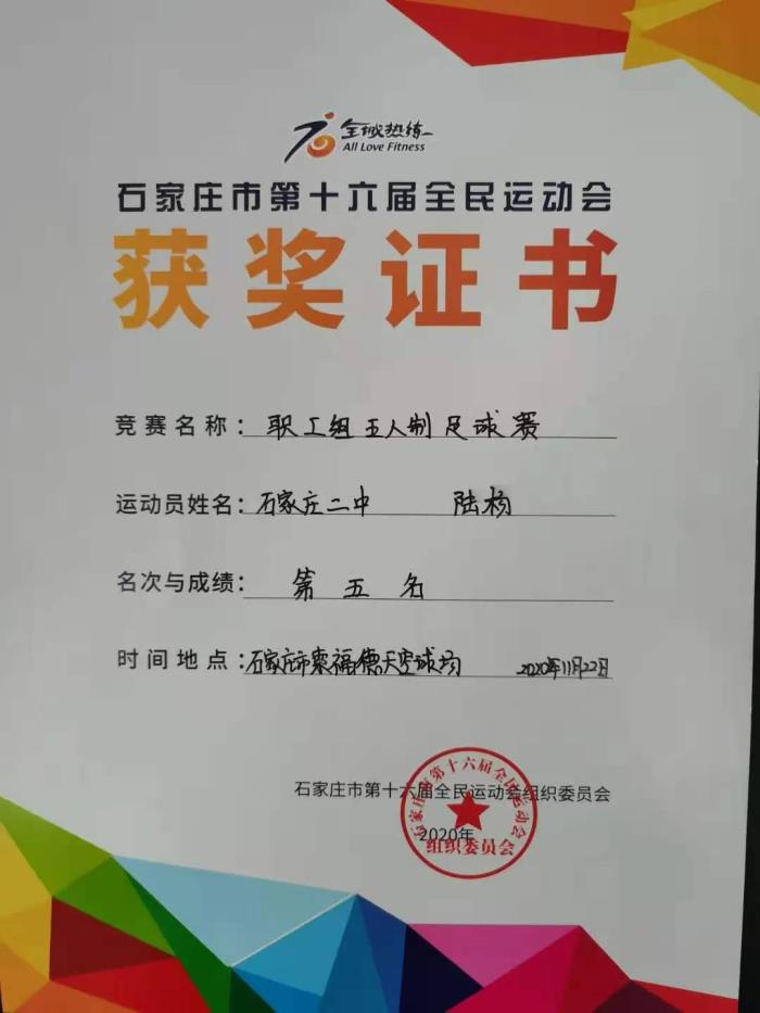 近日,2020年石家庄市第十六届全民运动会职工组比赛结束。本次活动由石家庄市人民政府主办,旨在丰富职工的文体生活,提高全市职工的健身意识。我校教工代表参加了篮球、羽毛球、足球组的比赛,并获得了足球比赛第五名、体育道德风尚奖等荣誉。特此向他们表示祝贺!